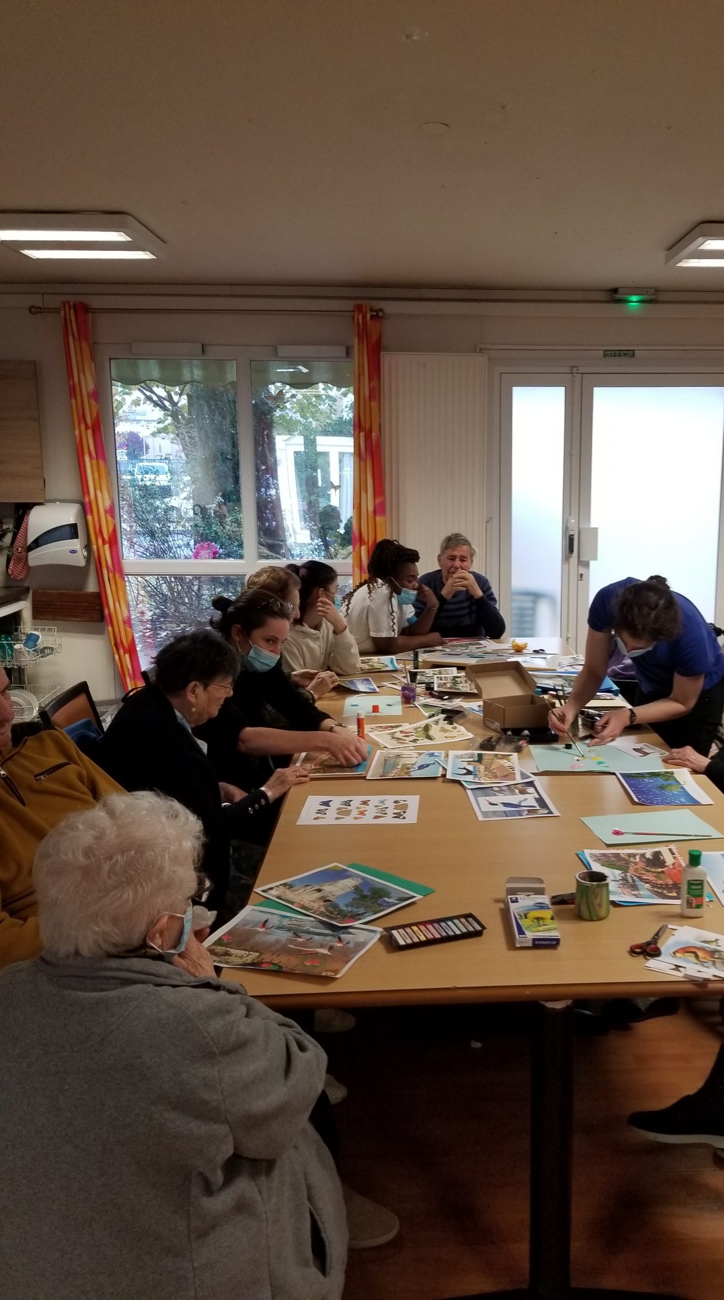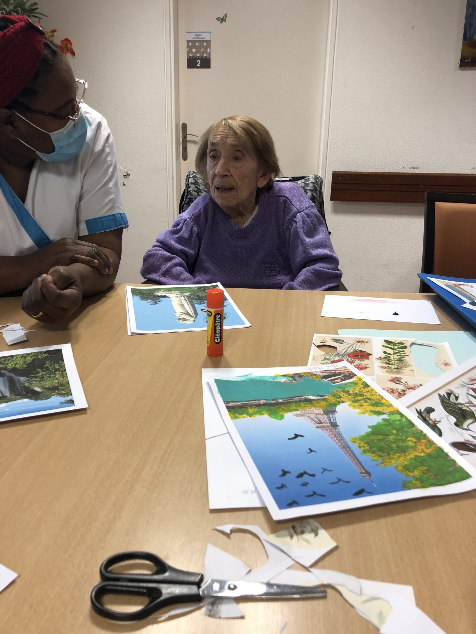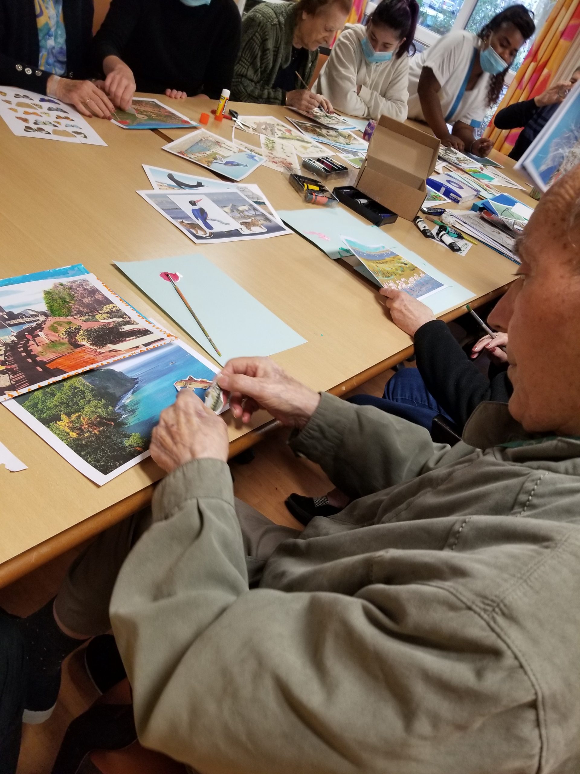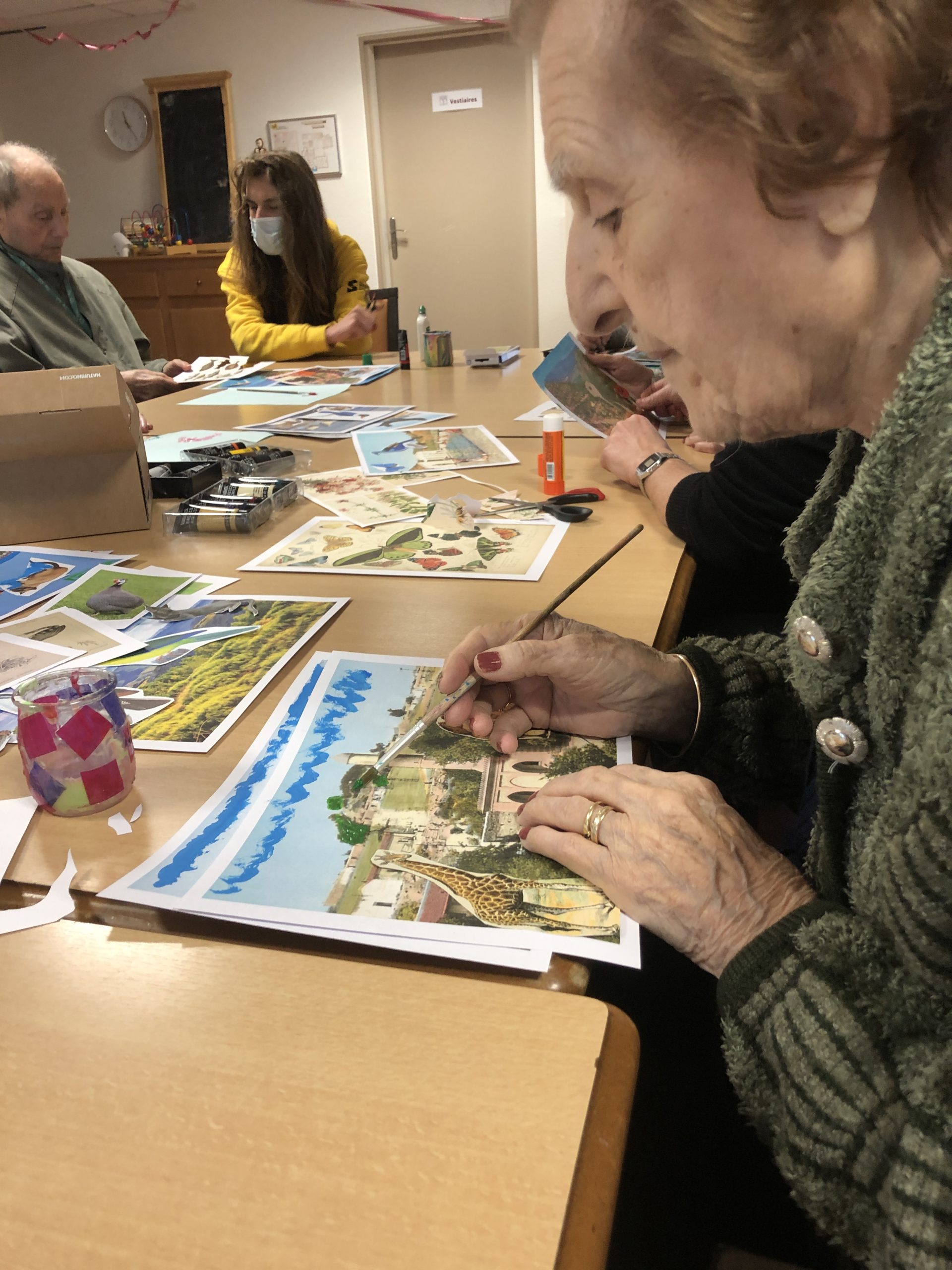 Quel plaisir de se réapproprier les différents lieux que l’on a pu visiter ! c’est grâce à Pauline, art thérapeute, qui nous a apporté de belles photos des différents endroits que les résidents ont connus pour faire appel à leur mémoire. Nous avons ensuite redécorées avec de la peinture et des collages d’animaux de toutes sortes. C’était un très bon moment sympathique d’ activité pour un résultat magnifique et des échanges autour de joyeux souvenirs!