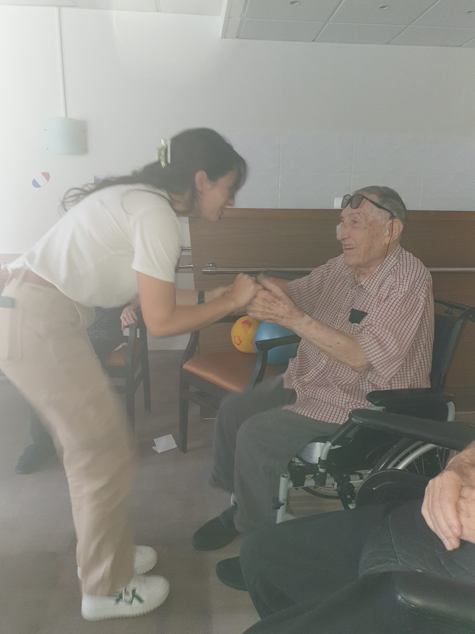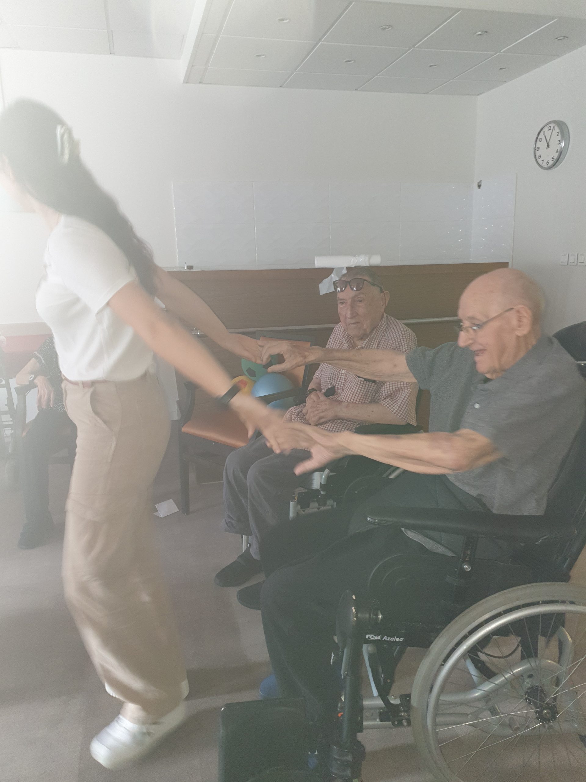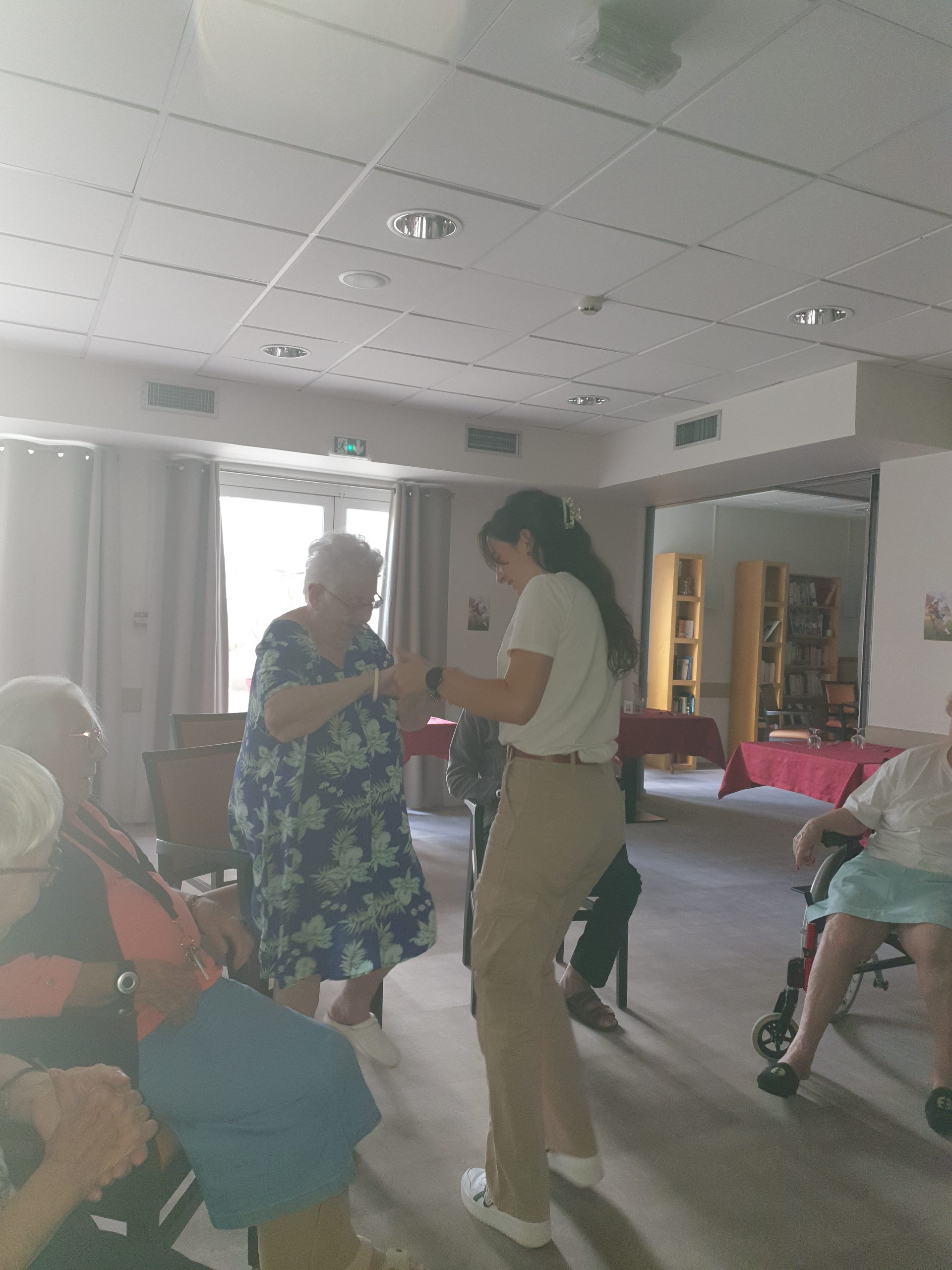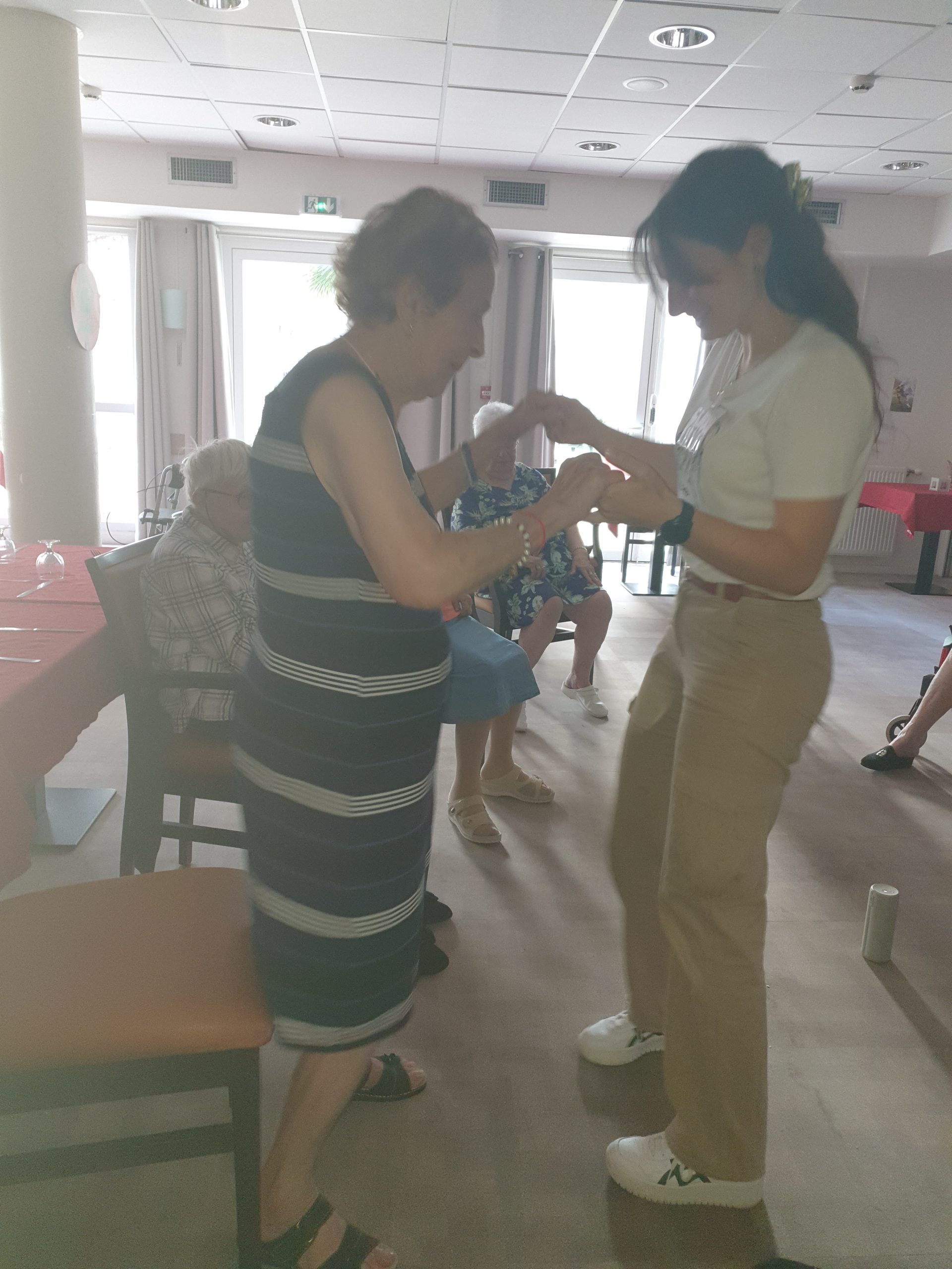 Tous les jeudis matin, avec sa bonne humeur, Marie psychomotricienne vient pratiquer des mouvements de réveils articulaires avec les résidents. C’est avec beaucoup d’application et de volonté que nos résidents réalisent les exercices. Marie termine toujours son atelier en les faisant danser sur des sons endiablés.