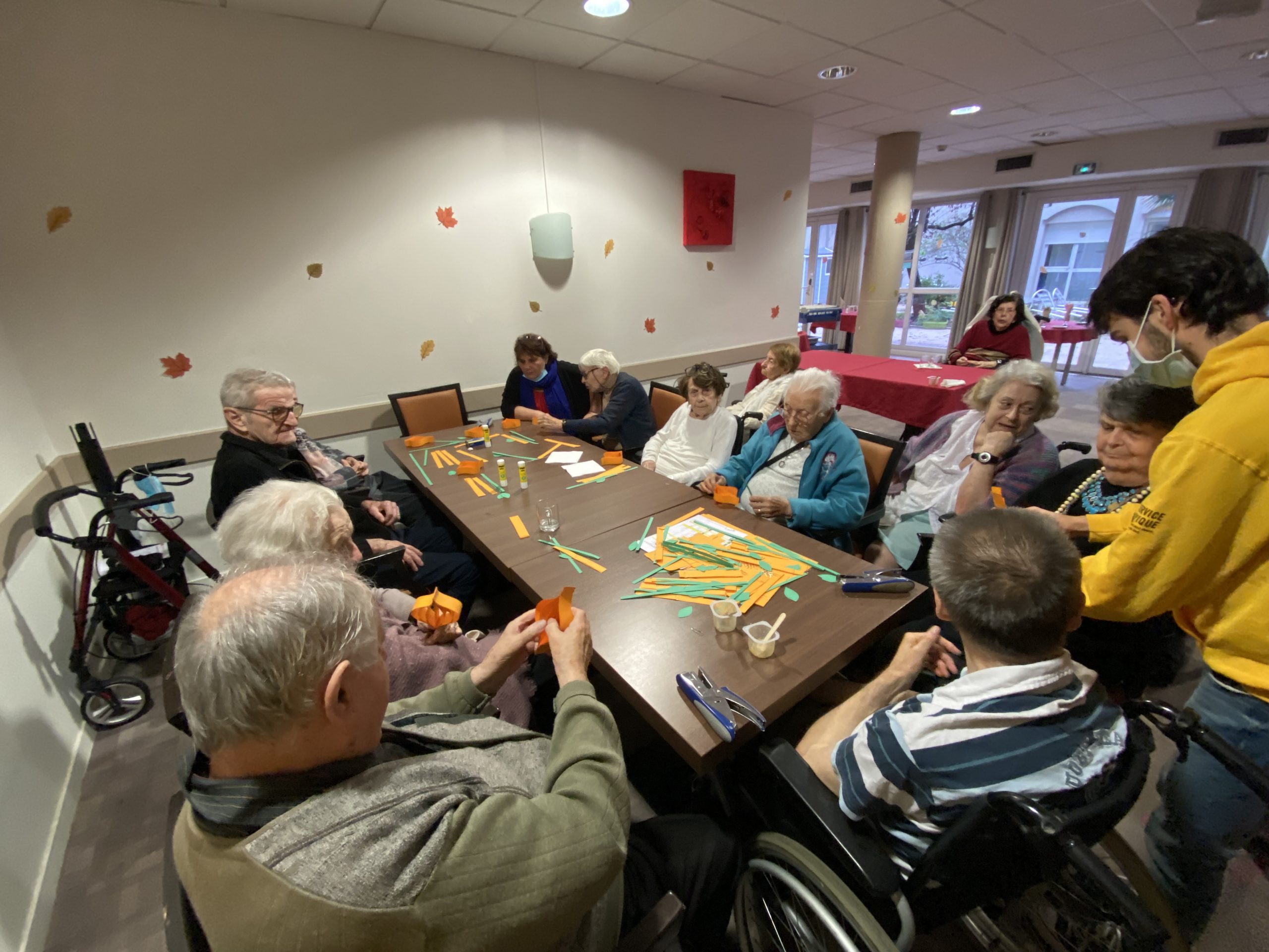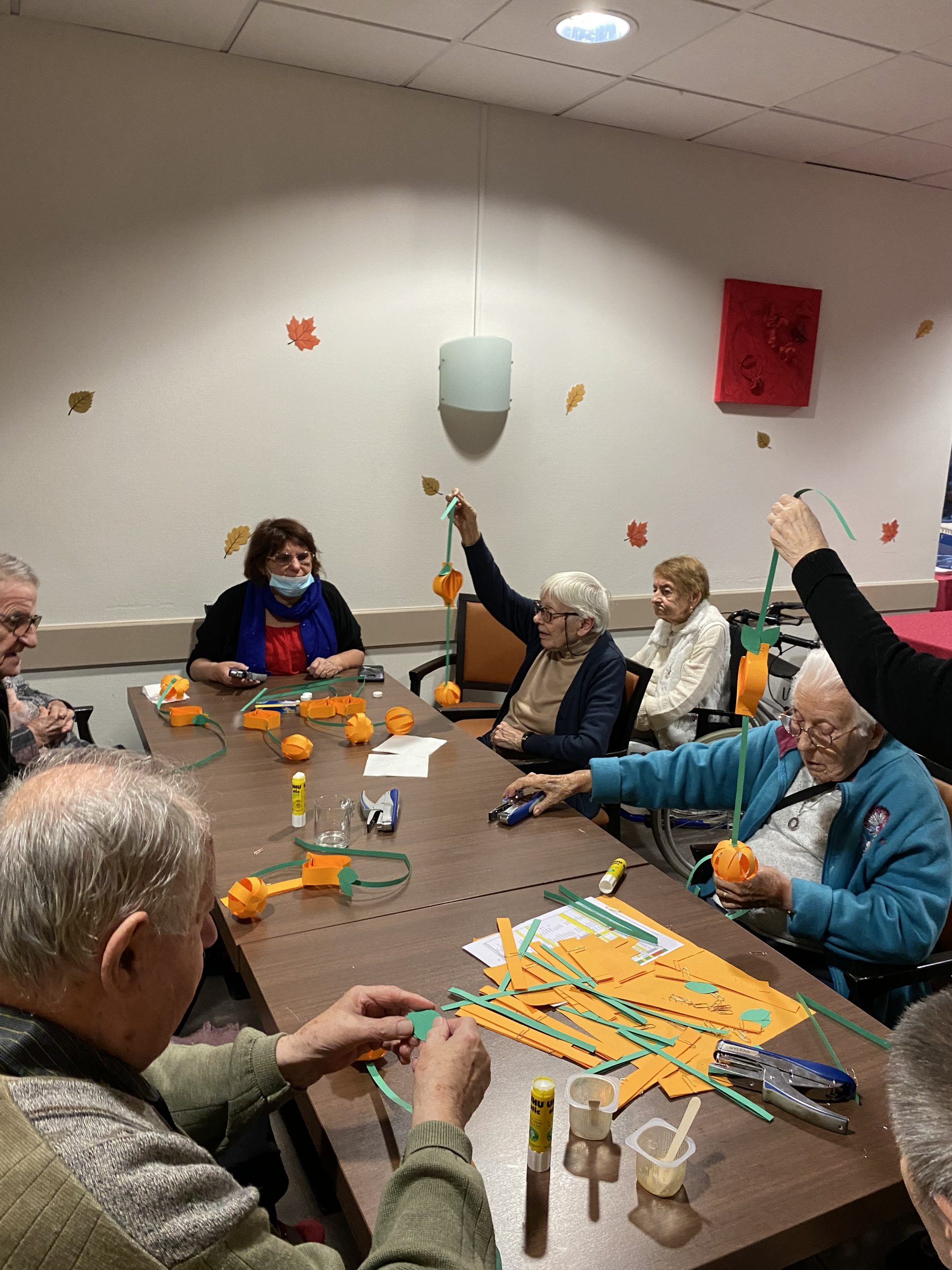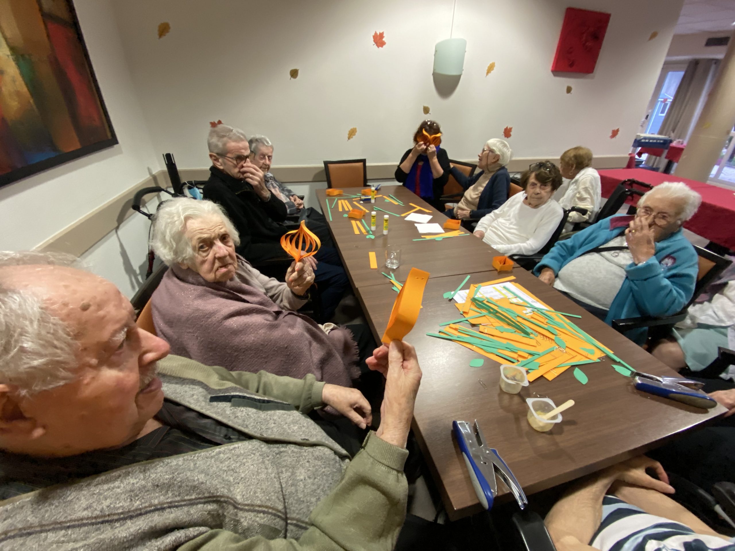 Aux côtés d’une dizaine de résidents, les deux nouveaux volontaires en service civique, Mattéo et Juline, ont préparé leur tout premier atelier manuel. L’objectif de l’animation était de redécorer la salle de restauration en créant des suspensions en papier en forme de citrouille. C’était un moment agréable, où les résidents ont pu se familiariser à nouveau avec les activités manuelles.