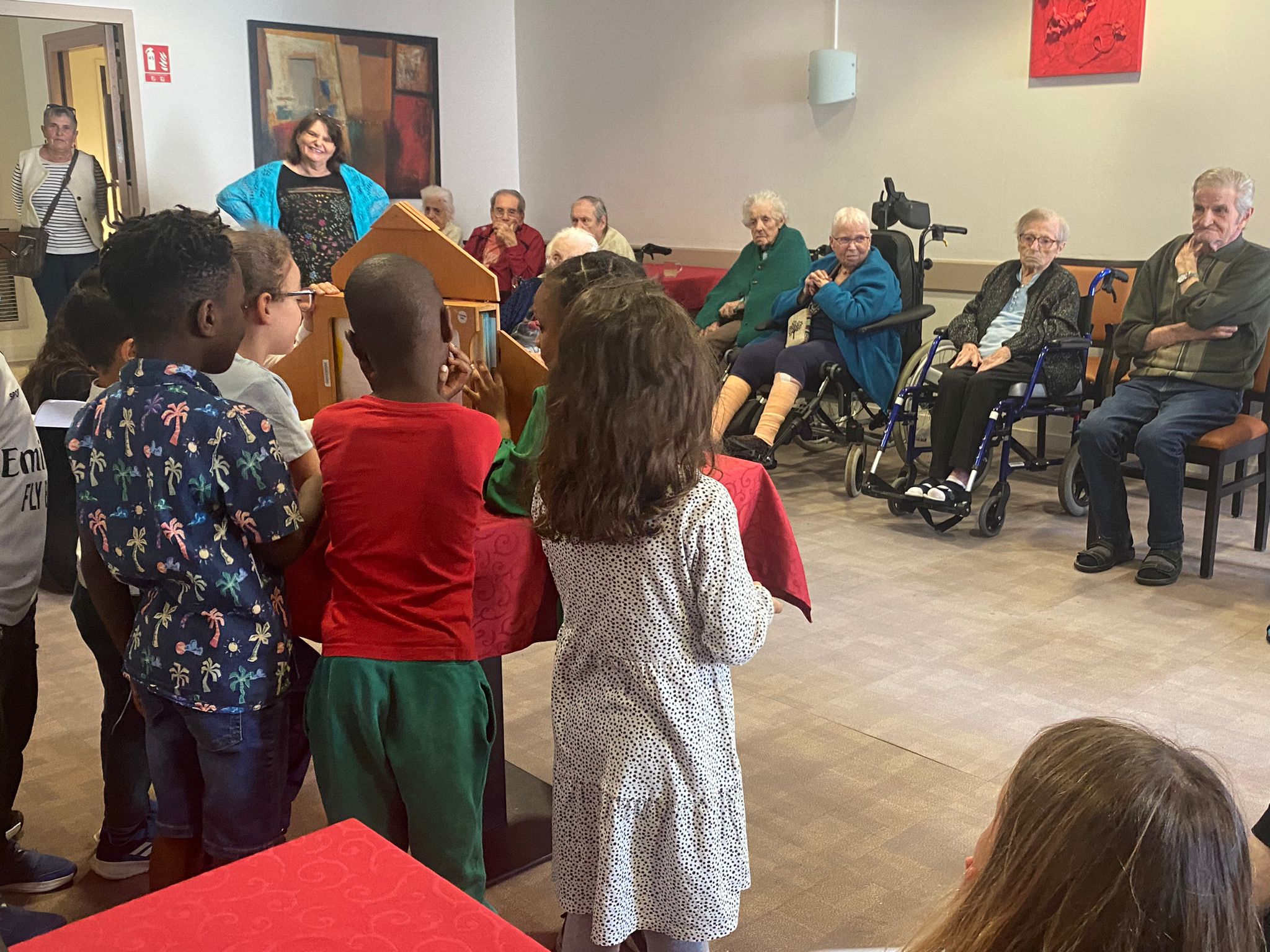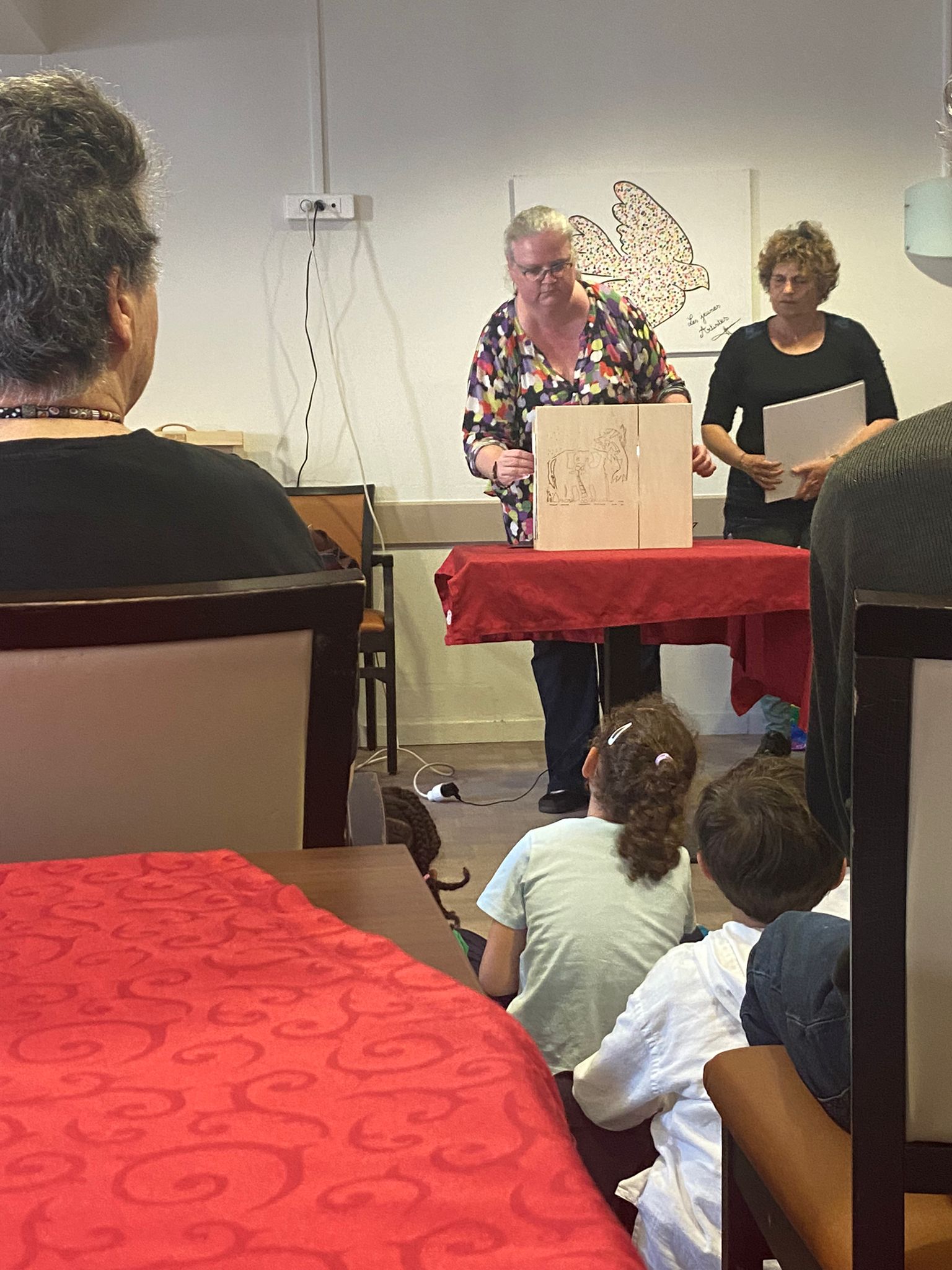 Nous avons reçu les enfants de l’école maternelle ‟ Jean Giono ” et Bibliobus au sein de la résidence le jeudi 30 mai. Les élèves ont préparé une petite histoire sur le bonhomme de pain d’épice mise en scène avec le Kamishibai (un petit théâtre japonais). Puis deux autres histoires ont été contées par Bibliobus. Nous avons fini ce beau moment de partage par un goûter.