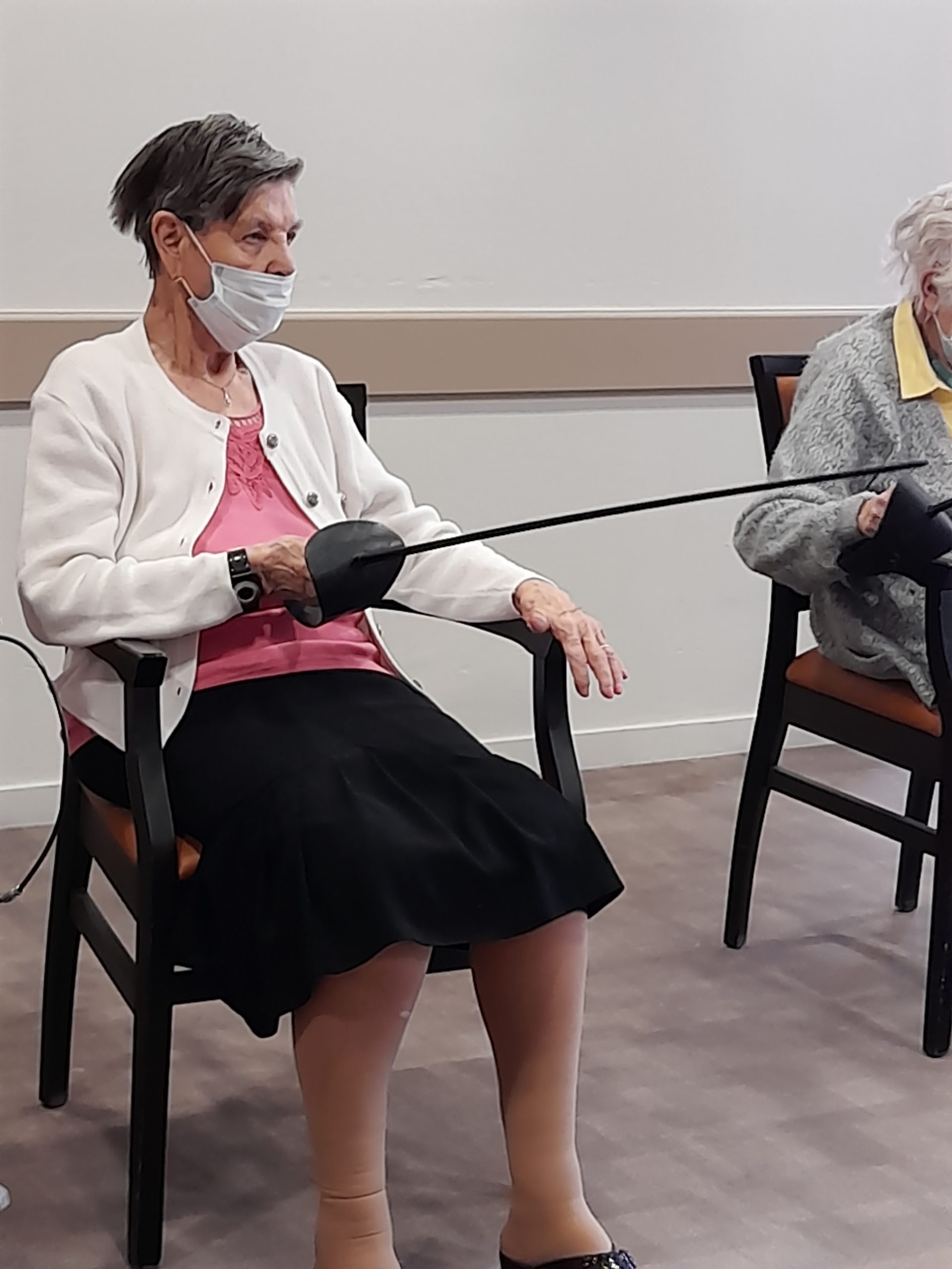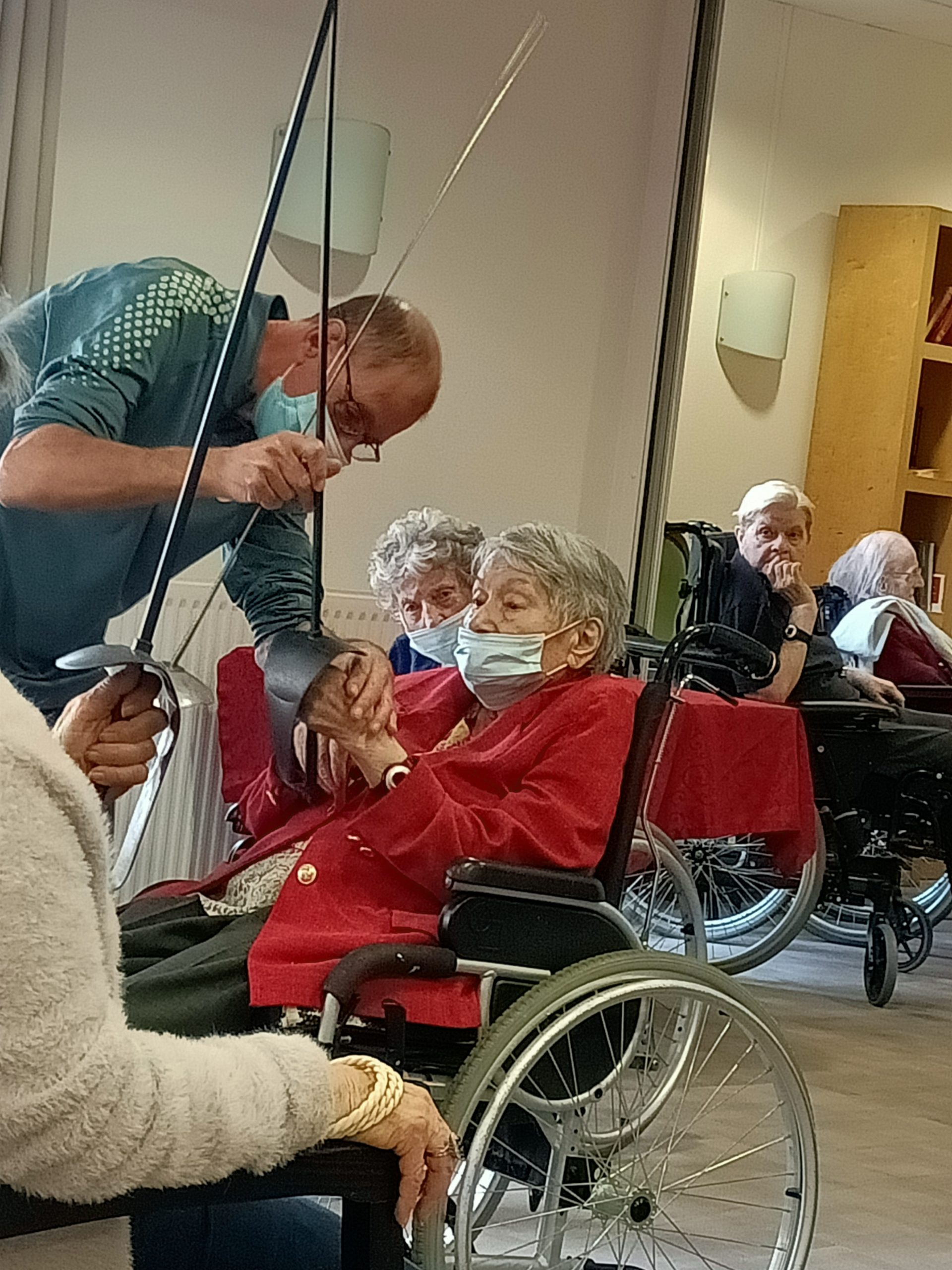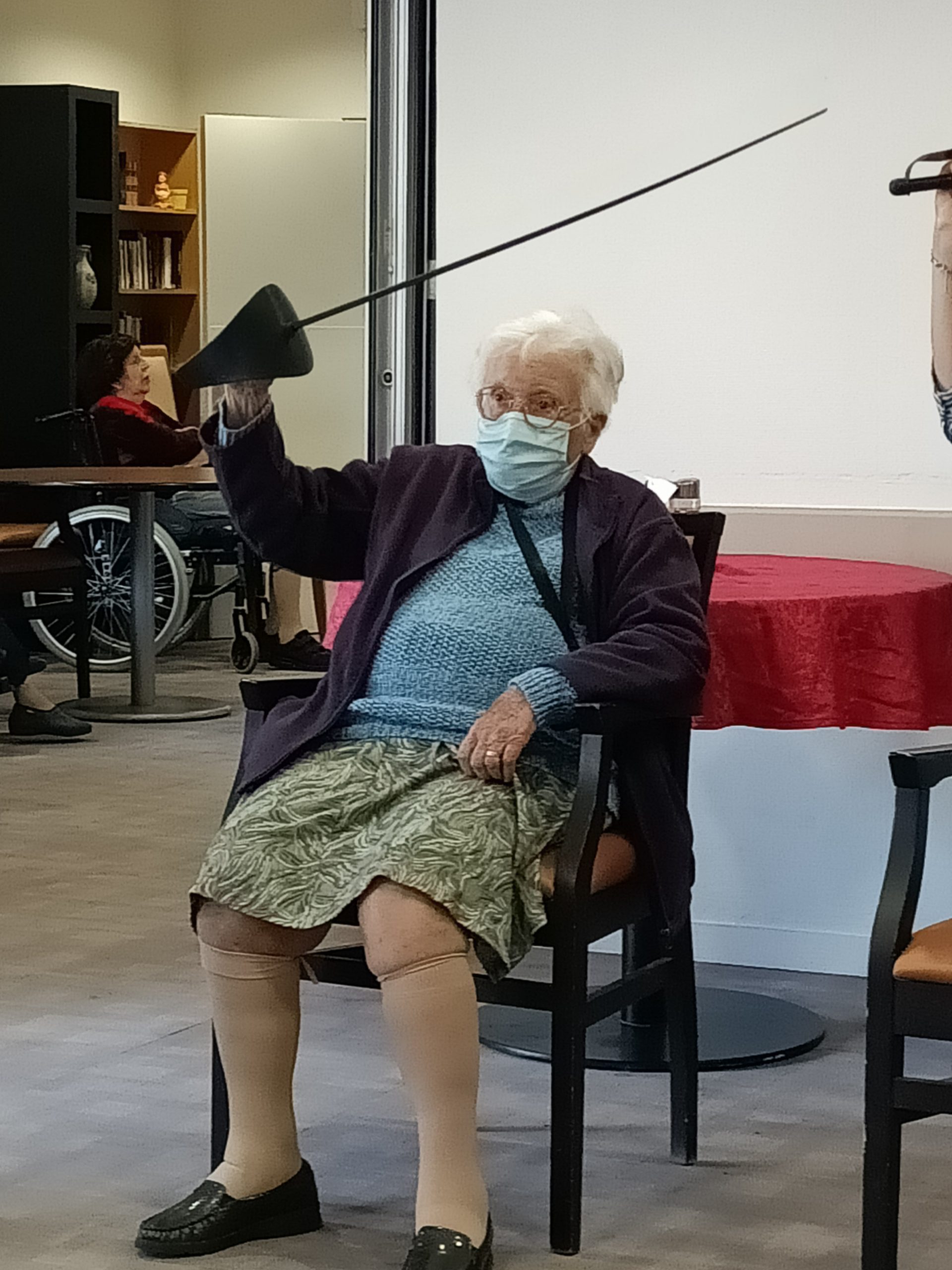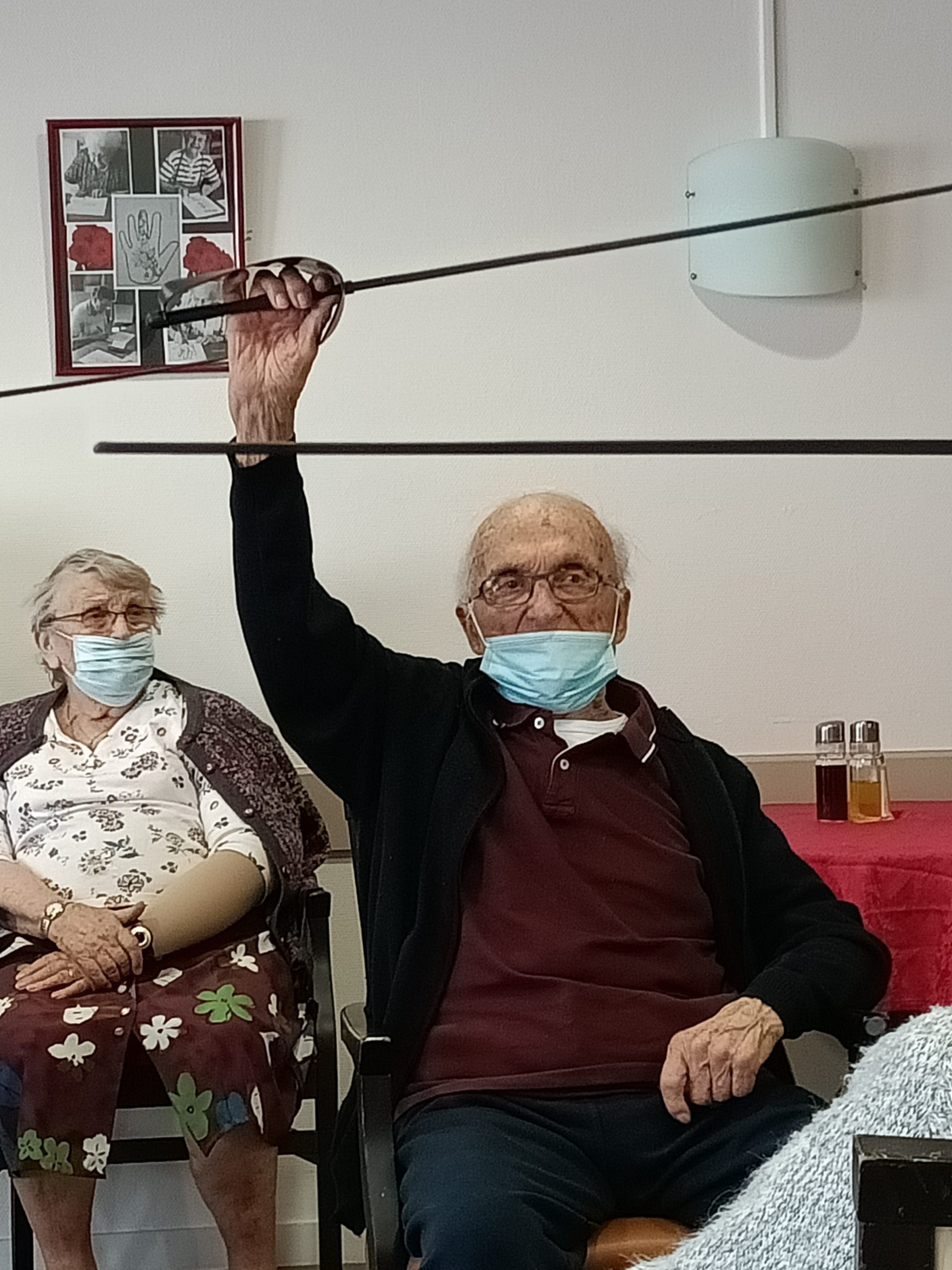 En cet après-midi de printemps ensoleillé, maître Hervé muni de son épée est venu donner un cours d’escrime. Les résidents étaient face à face et se sont confrontés en duel ! Ils ont joué le jeu et étaient très impliqués. Hervé les a fait participer à plusieurs activités ludiques pour faire travailler la mémoire et la motricité. Il y a eu une belle cohésion de groupe. Les résidents sont maintenant de vrais mousquetaires !