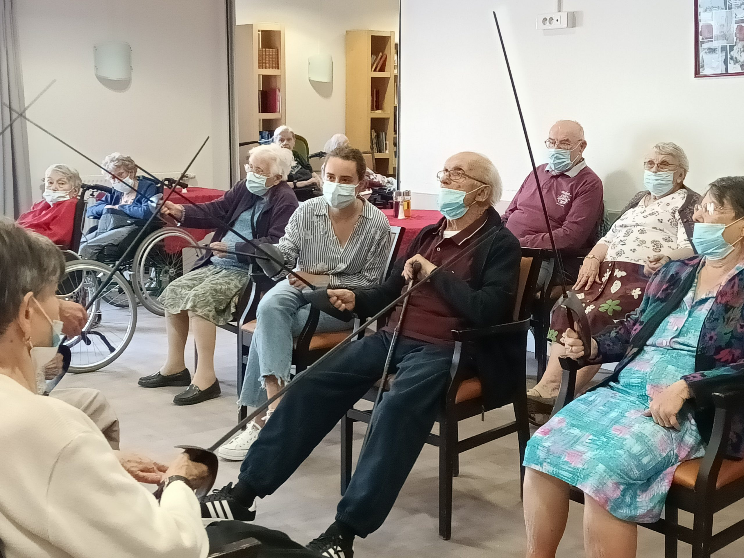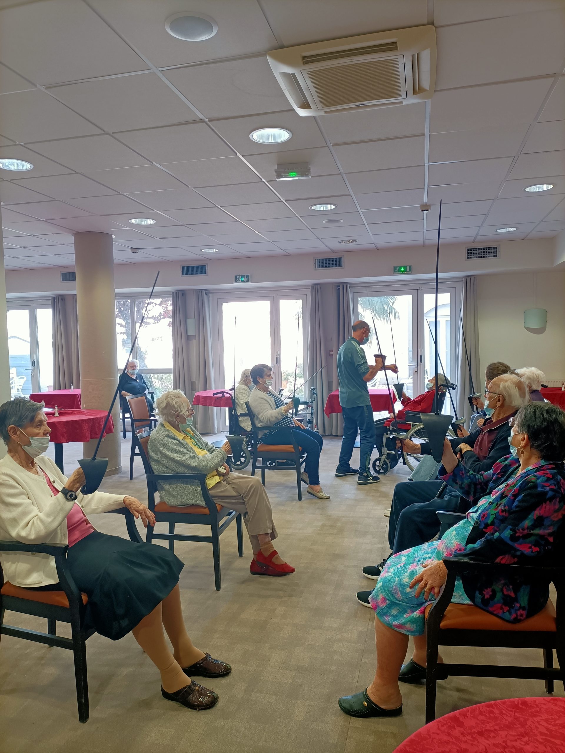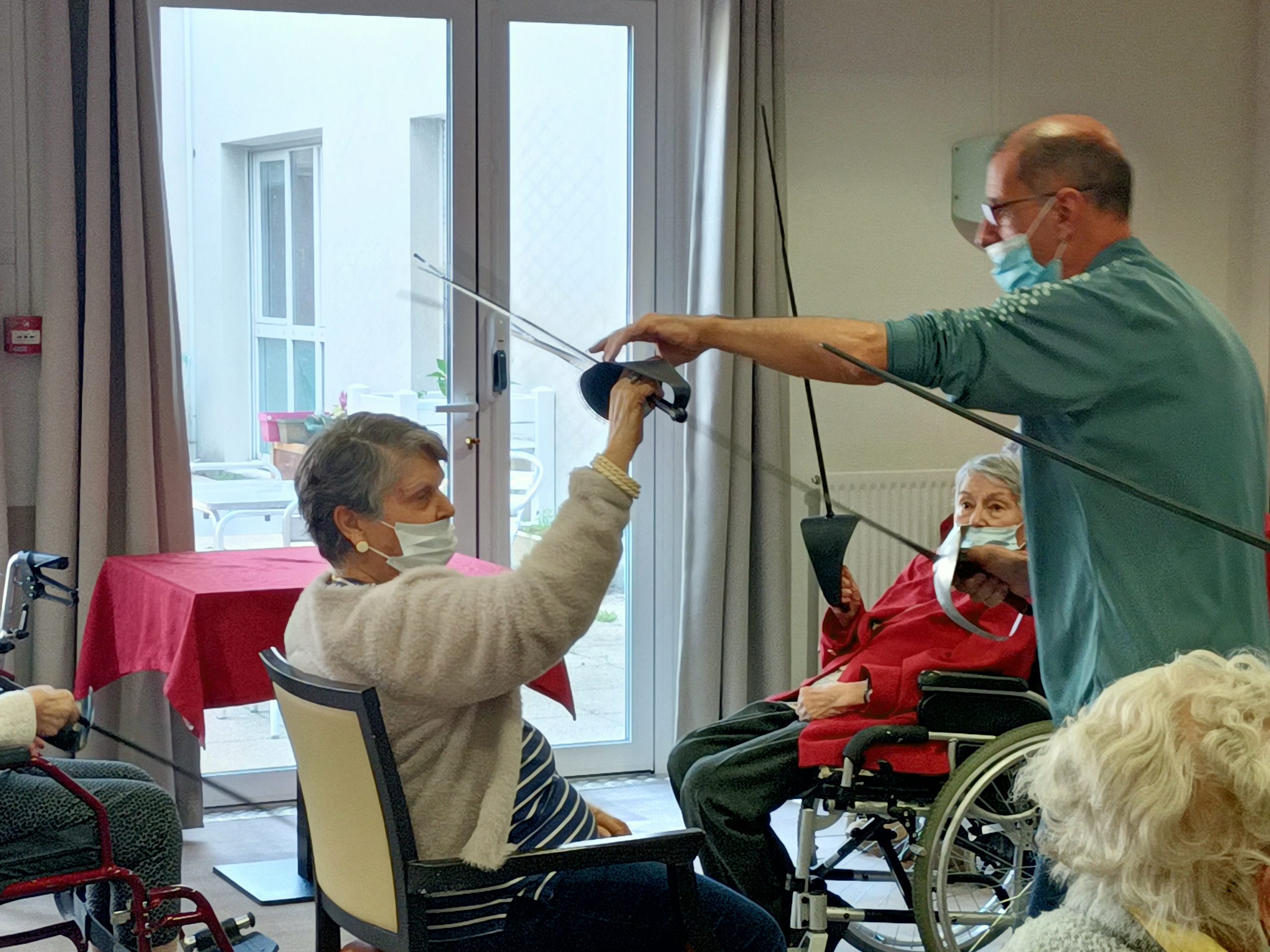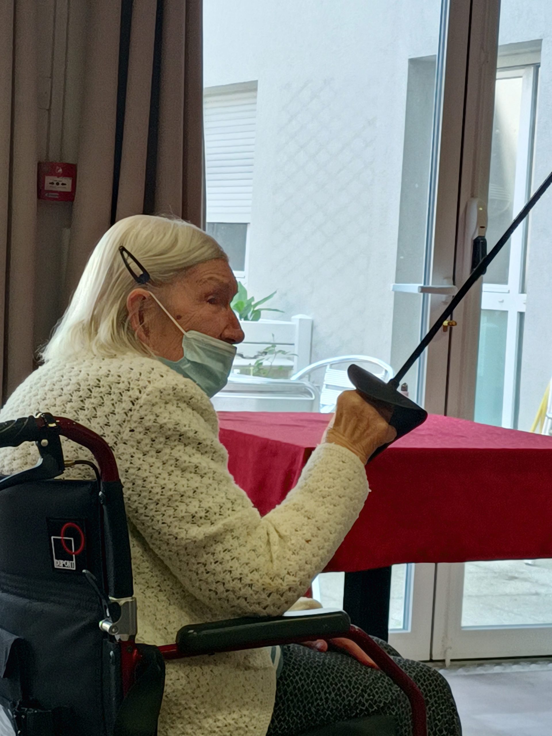 En cet après-midi de printemps ensoleillé, maître Hervé muni de son épée est venu donner un cours d’escrime. Les résidents étaient face à face et se sont confrontés en duel ! Ils ont joué le jeu et étaient très impliqués. Hervé les a fait participer à plusieurs activités ludiques pour faire travailler la mémoire et la motricité. Il y a eu une belle cohésion de groupe. Les résidents sont maintenant de vrais mousquetaires !