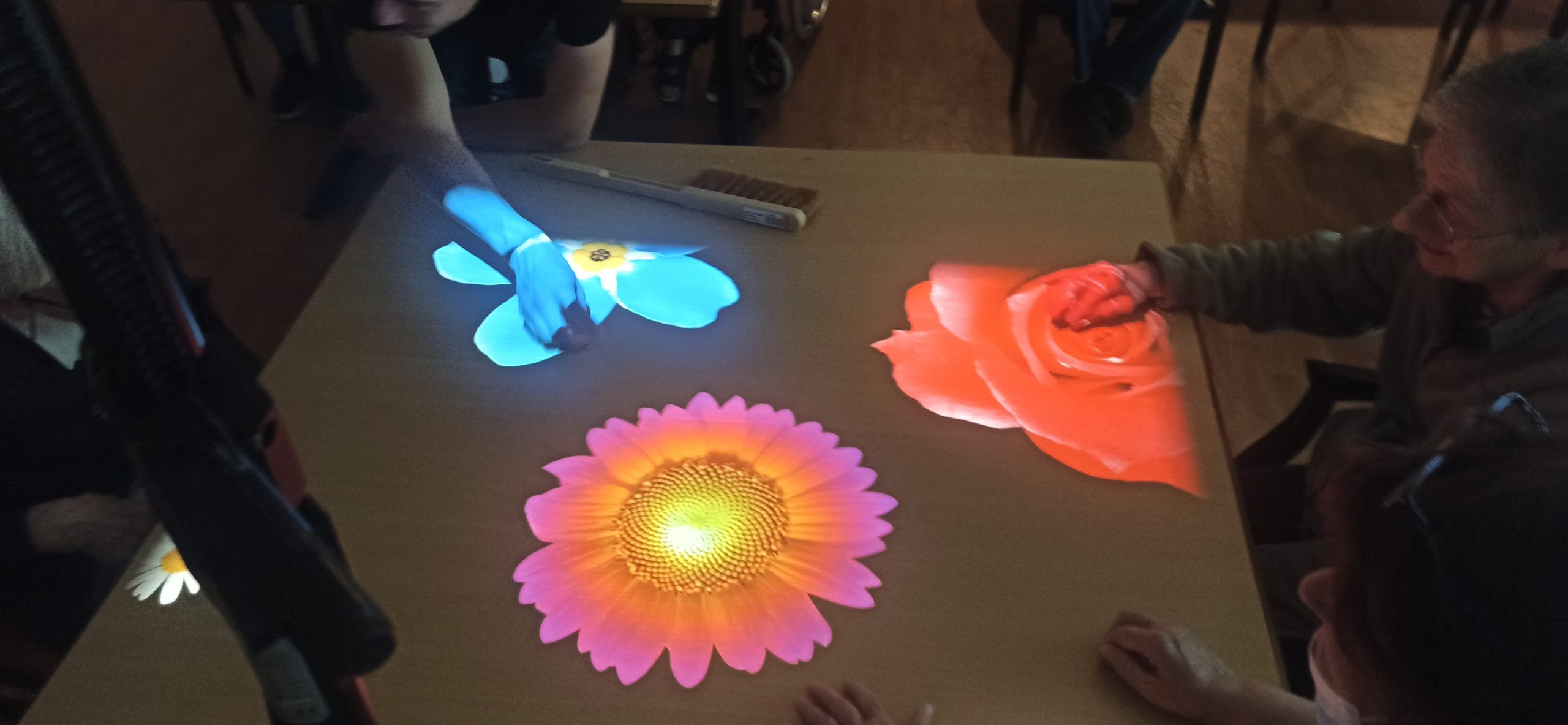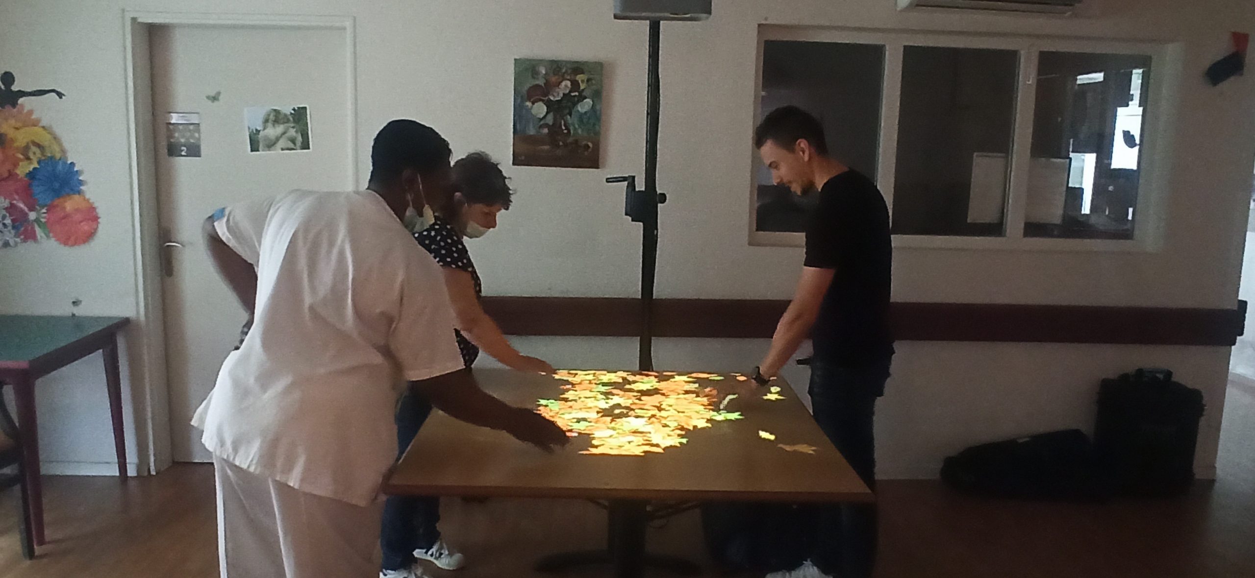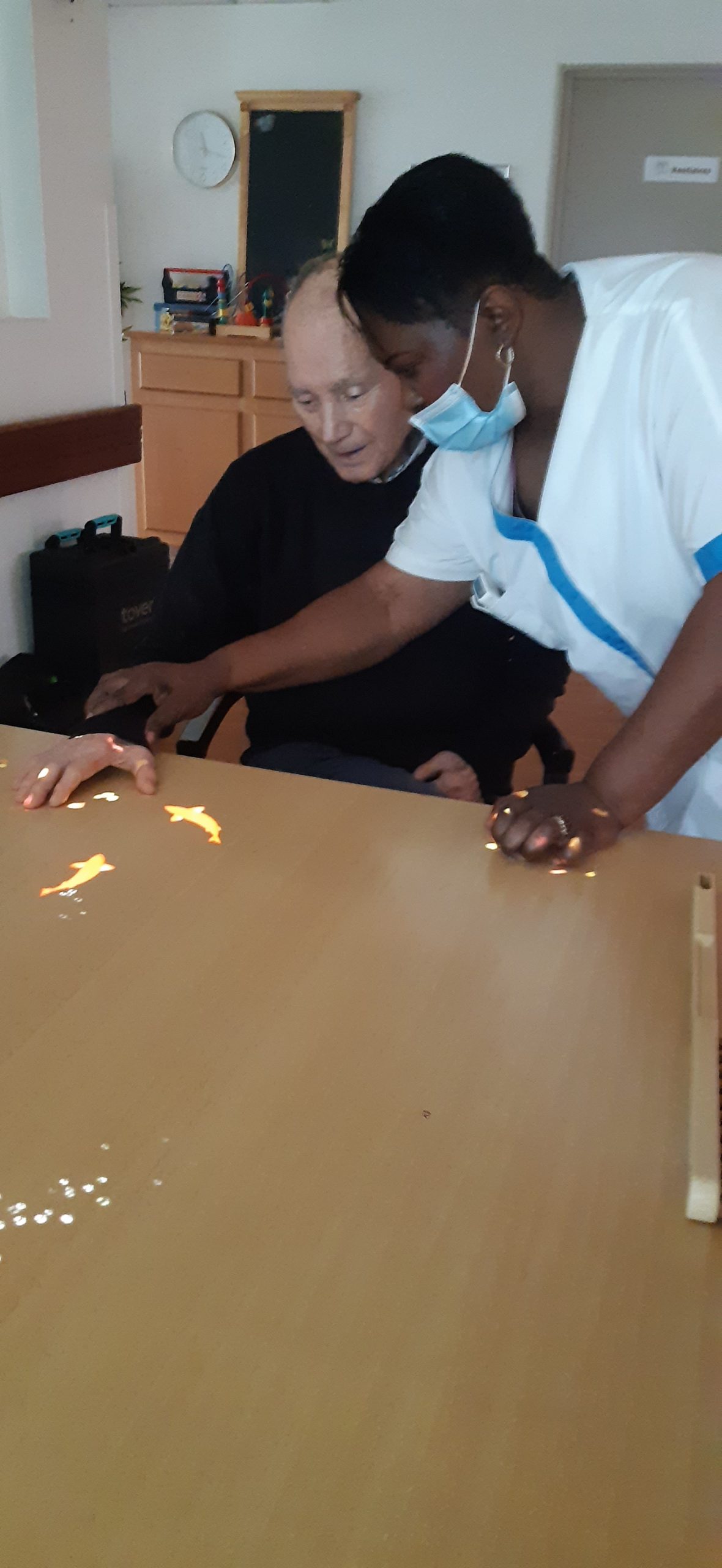 La roseraie (notre unité protégée) a accueilli un intervenant de la MJ INNOU pour une démonstration de la Tovertafel. Cette table interactive est composée de plusieurs jeux différents qui stimulent les réactions cognitives ou apaisent les moments de stress et d’anxiété pour des résidents atteints de troubles cognitifs. Les résidents de la roseraie ont pu découvrir cette nouvelle technologie agréable, colorée et musicale. L’amusement et la détente étaient ressentis.