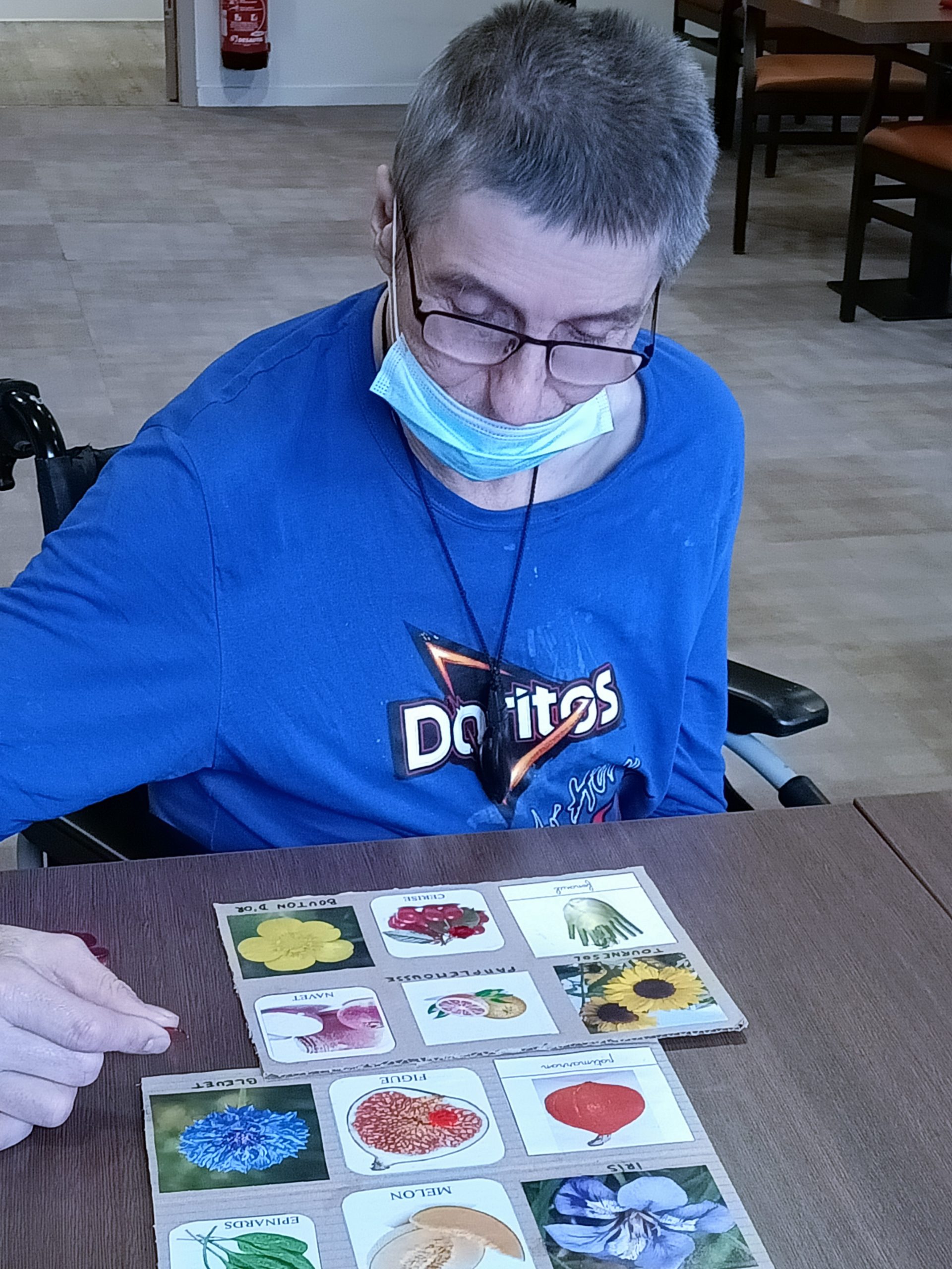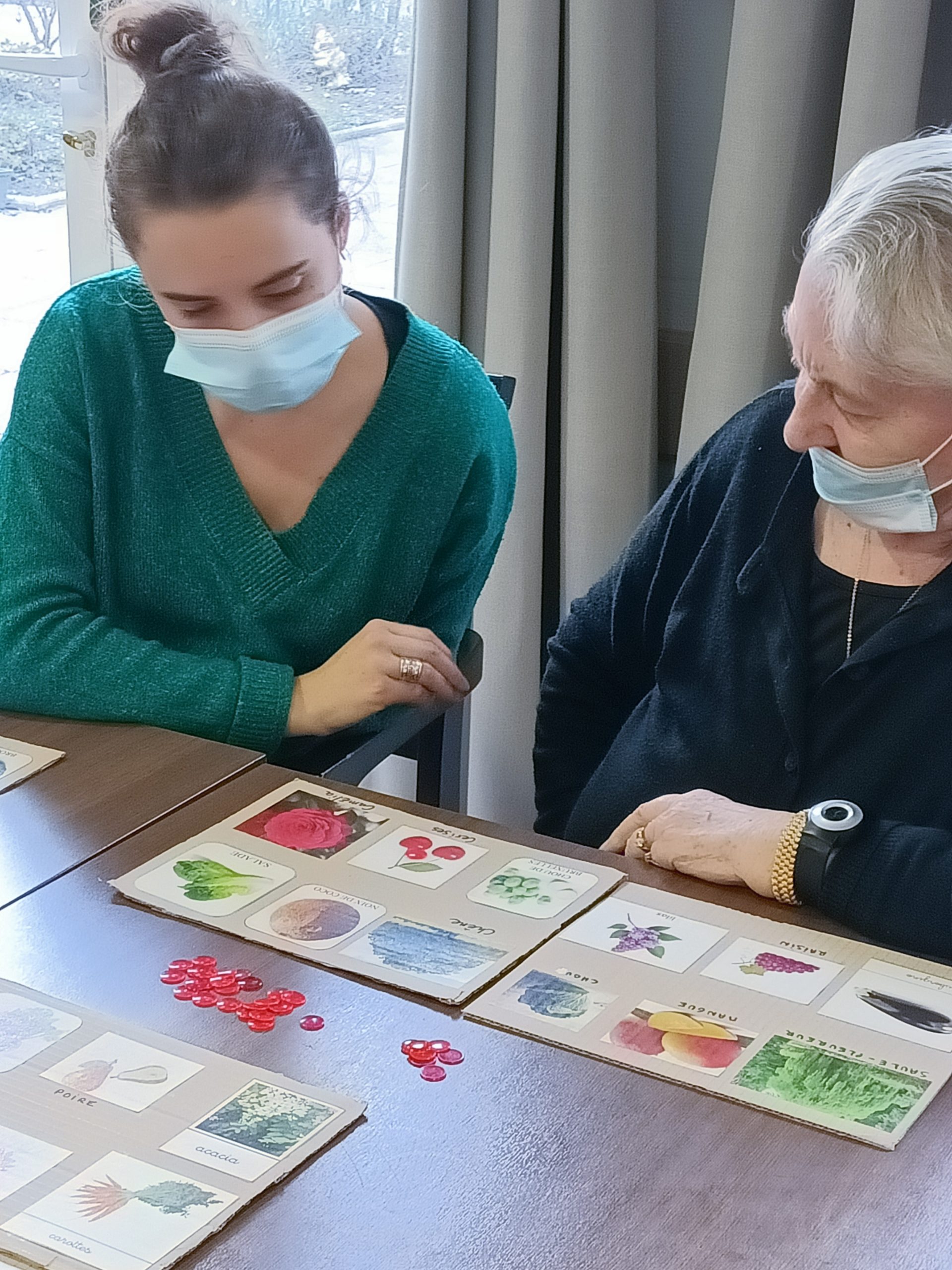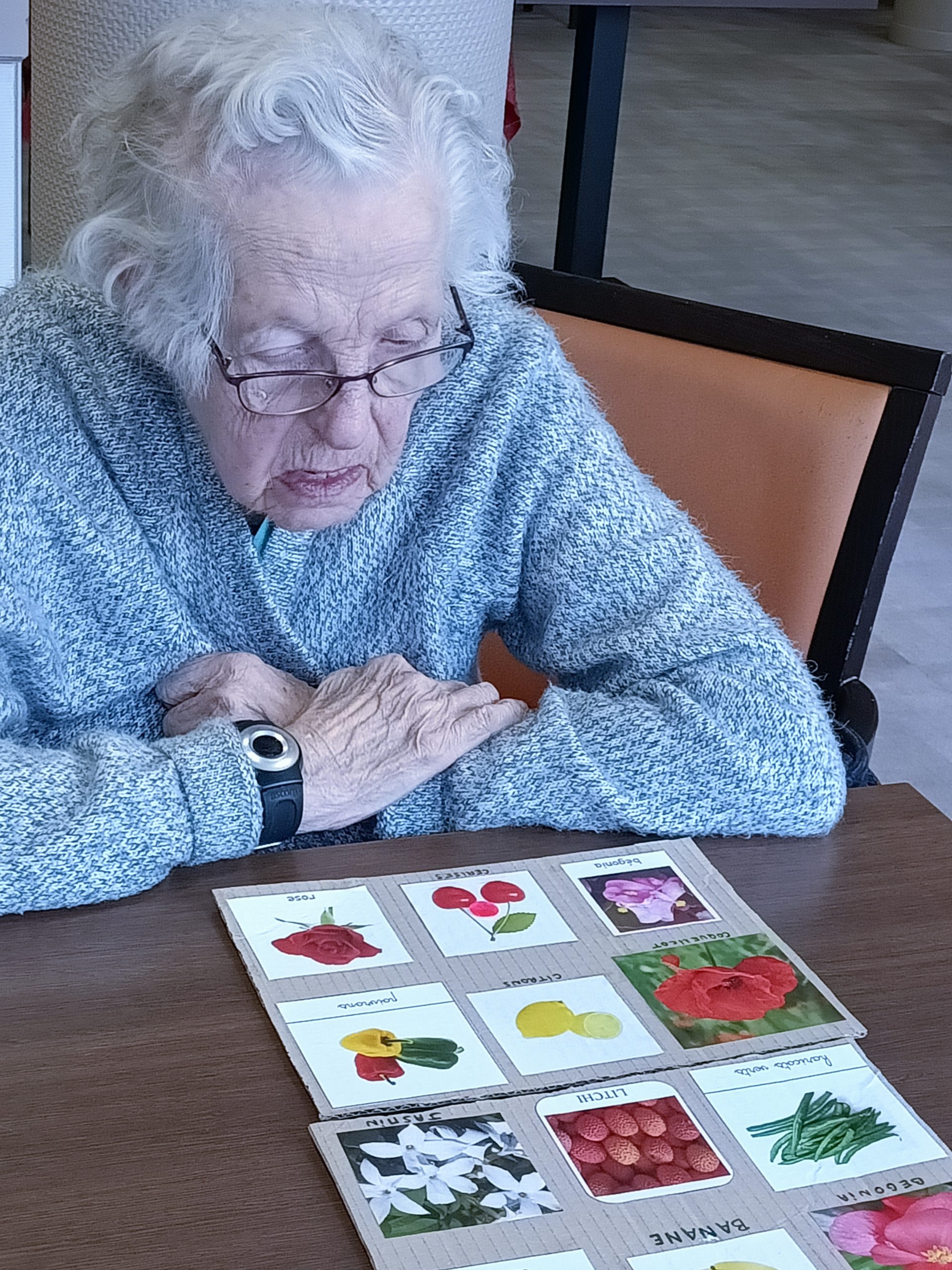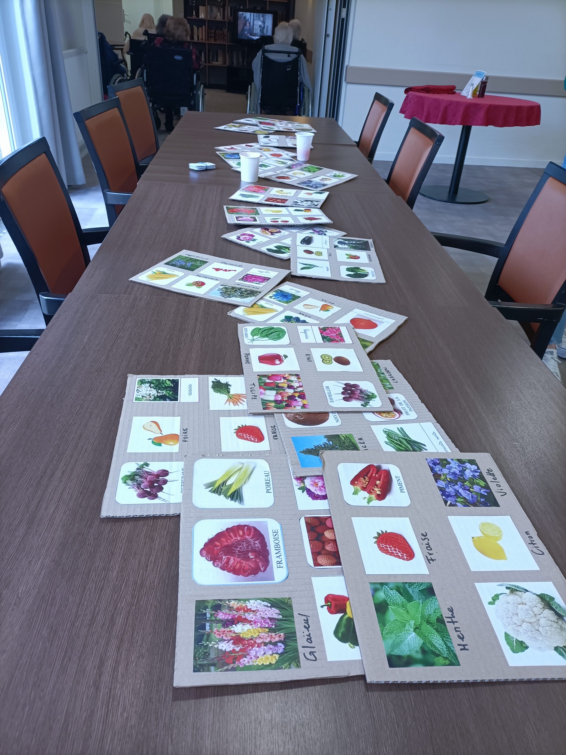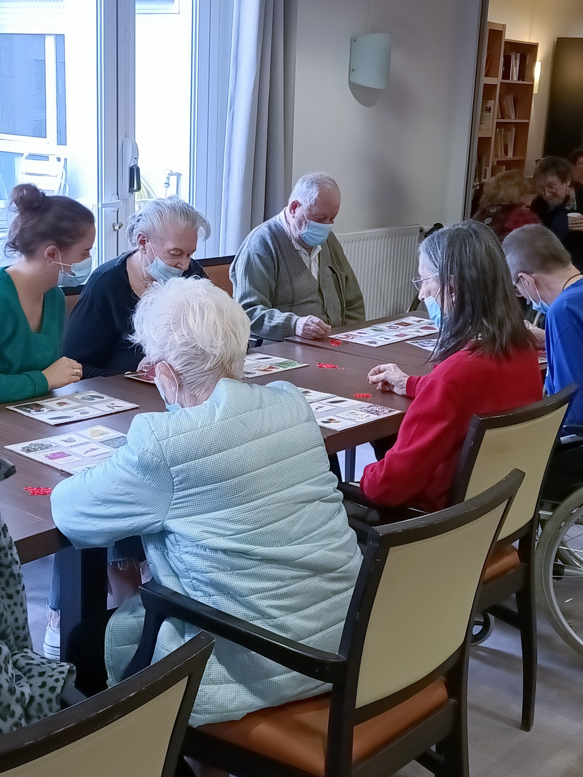 Lucile et Juliette, nos volontaires civiques, ont commencé le projet des animations autour du jardin. Elles ont créé un loto jardin. Les résidents ont revisité le loto avec des fleurs, des arbres, des légumes et des fruits. Ils ont trouvé le jeu intéressant et ludique. Ce fut une belle découverte.