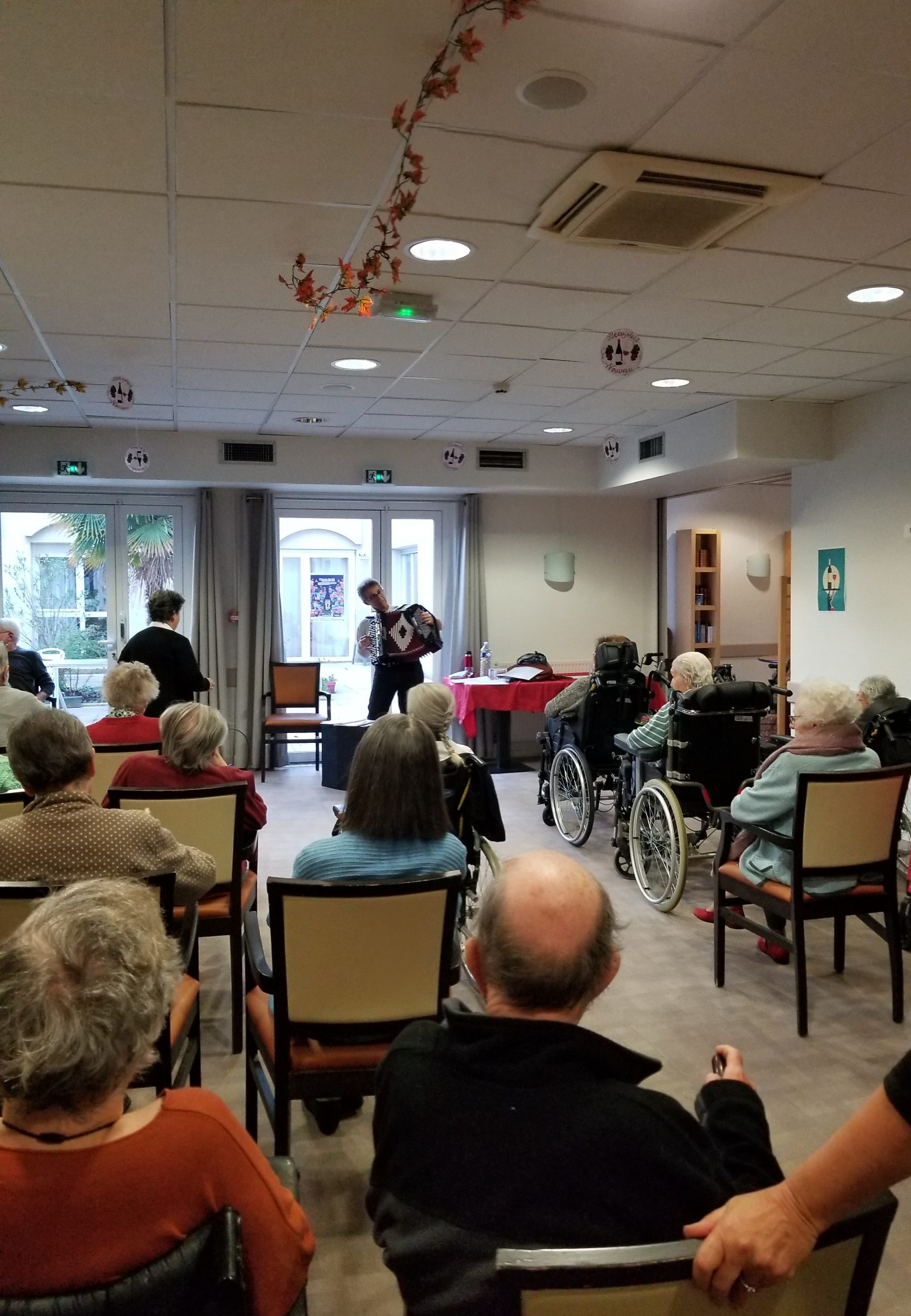 Il est arrivé ? à minuit ? à Lyon?  mais qui c’est ? C’est bien sûr notre traditionnel beaujolais nouveau. Les résidents ont dégusté ce midi ce vin rouge venu de la région du beaujolais. Ce verre de vin était accompagné d’un menu régional de Lyon. L’après-midi Jean-Pierre, accordéoniste, a interprété des morceaux de musique pour terminer cette célébration traditionnelle.