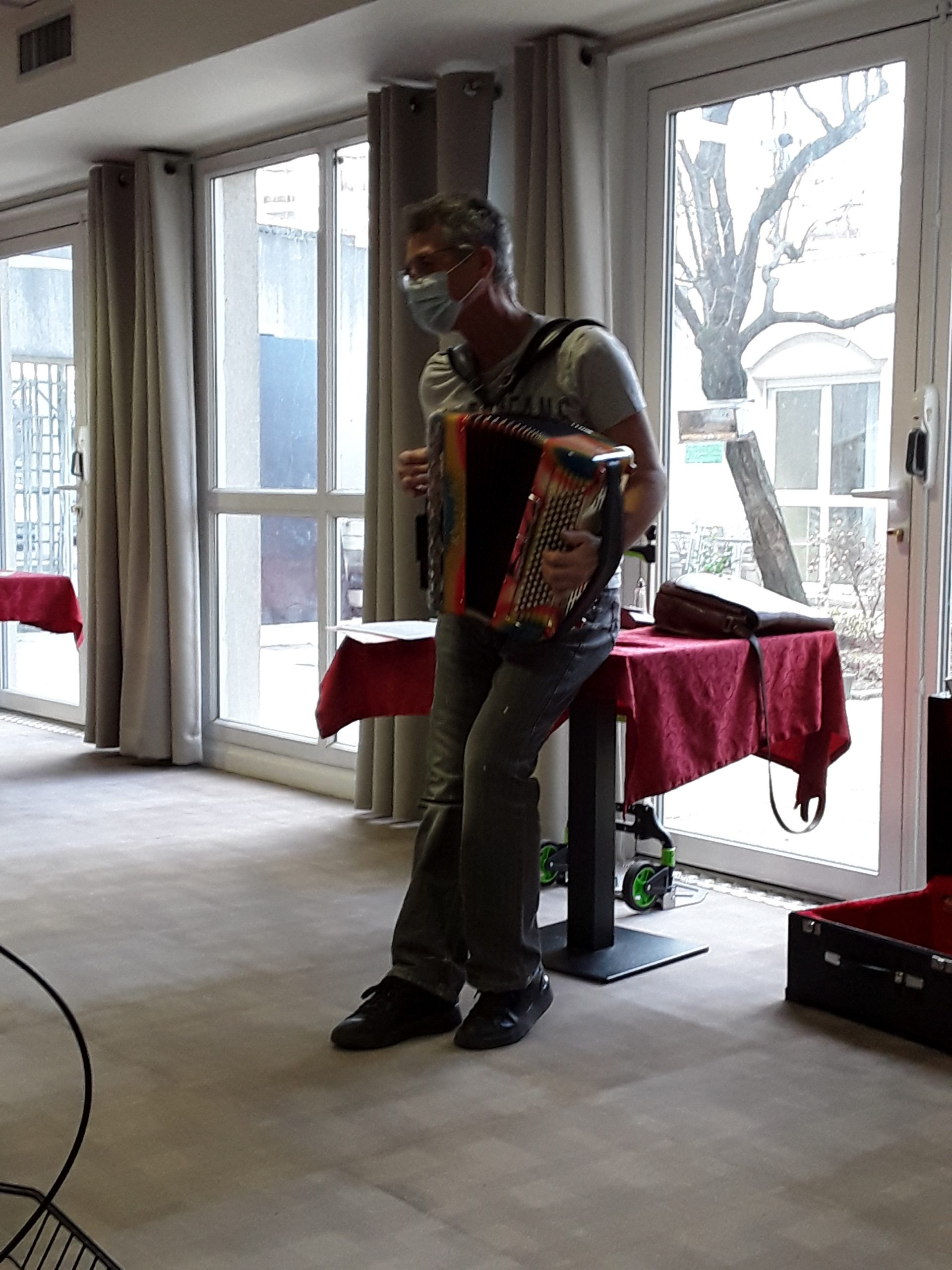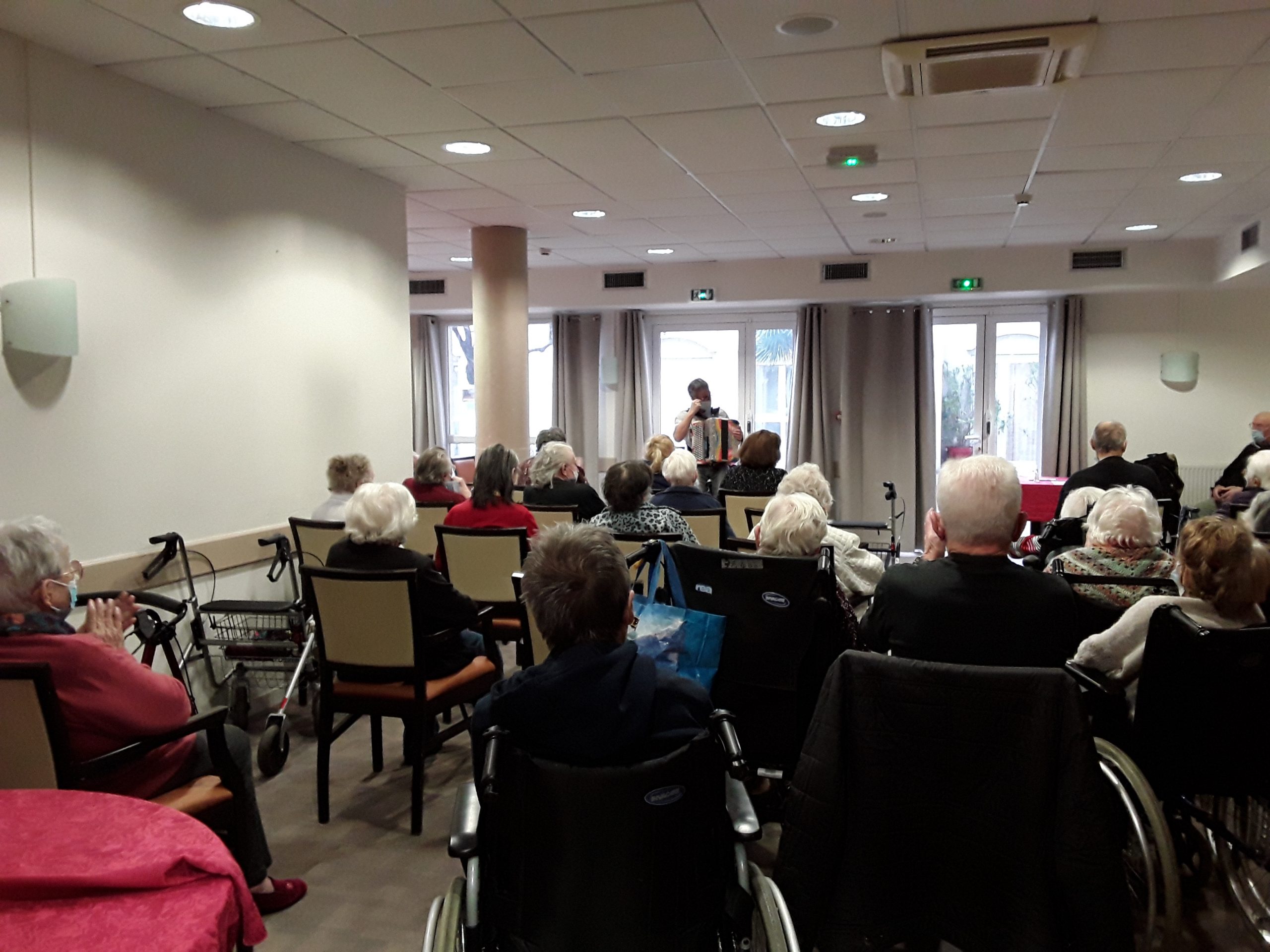 A la demande des résidents lors de la commission des animations, nous avons reçu un accordéoniste, Monsieur Jean-Pierre FABBRI. Celui-ci a interprété des morceaux de musique qui nous ont fait revivre différentes époques. Les résidents ont été ravis de cette rencontre.