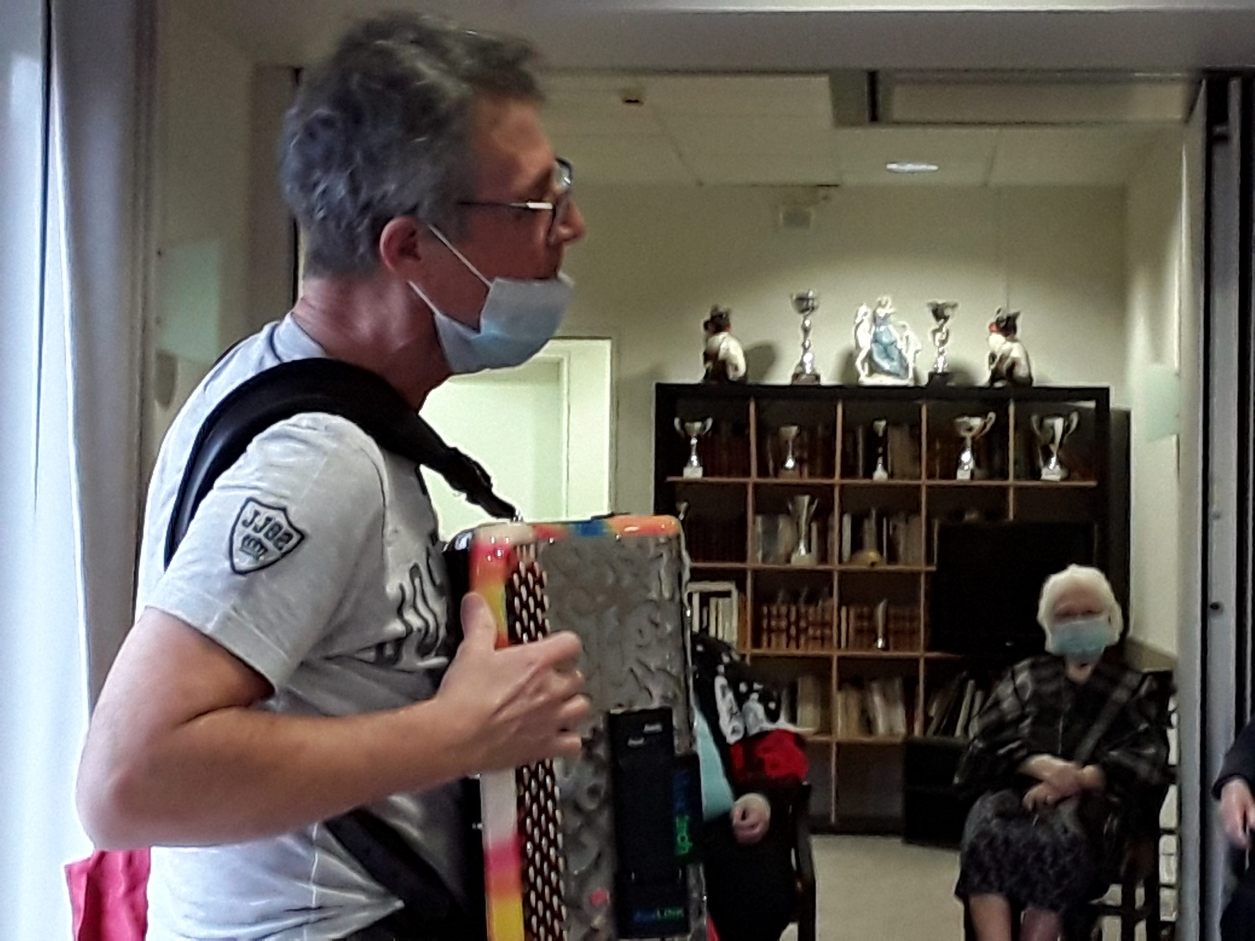 Mon père qui, de par son état de santé, ne peut participer qu’à trop peu d’animations, a bien apprécié l’accordéon. D’après ce que l’on a pu voir… Que l’accordéoniste s’approche de lui, l’a fait sourire !