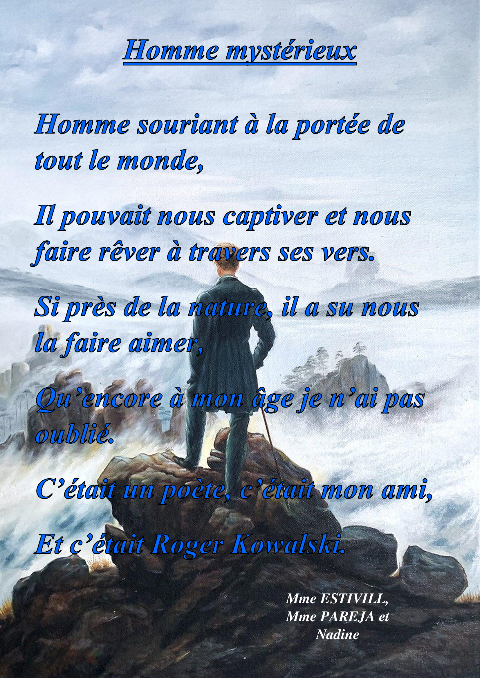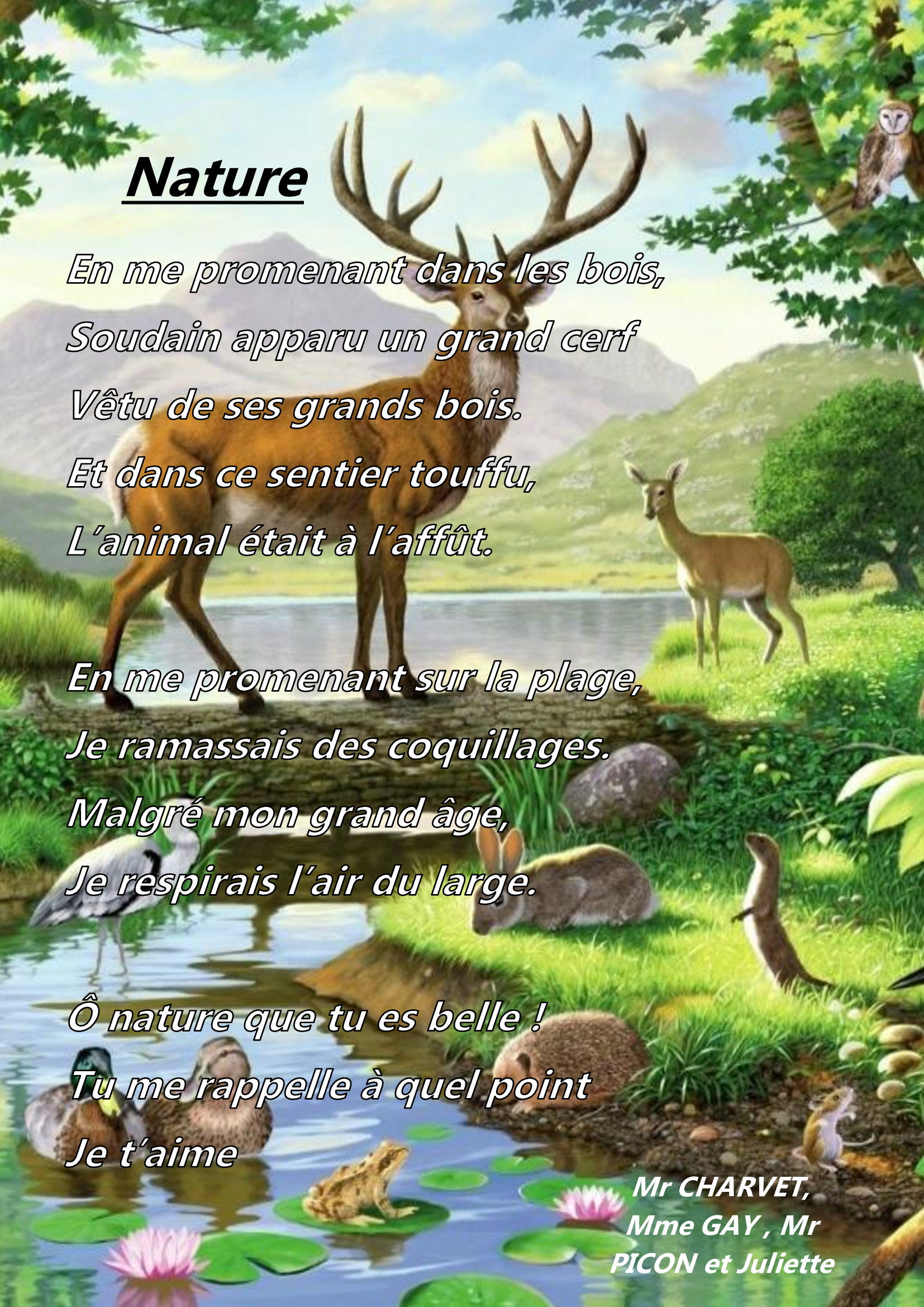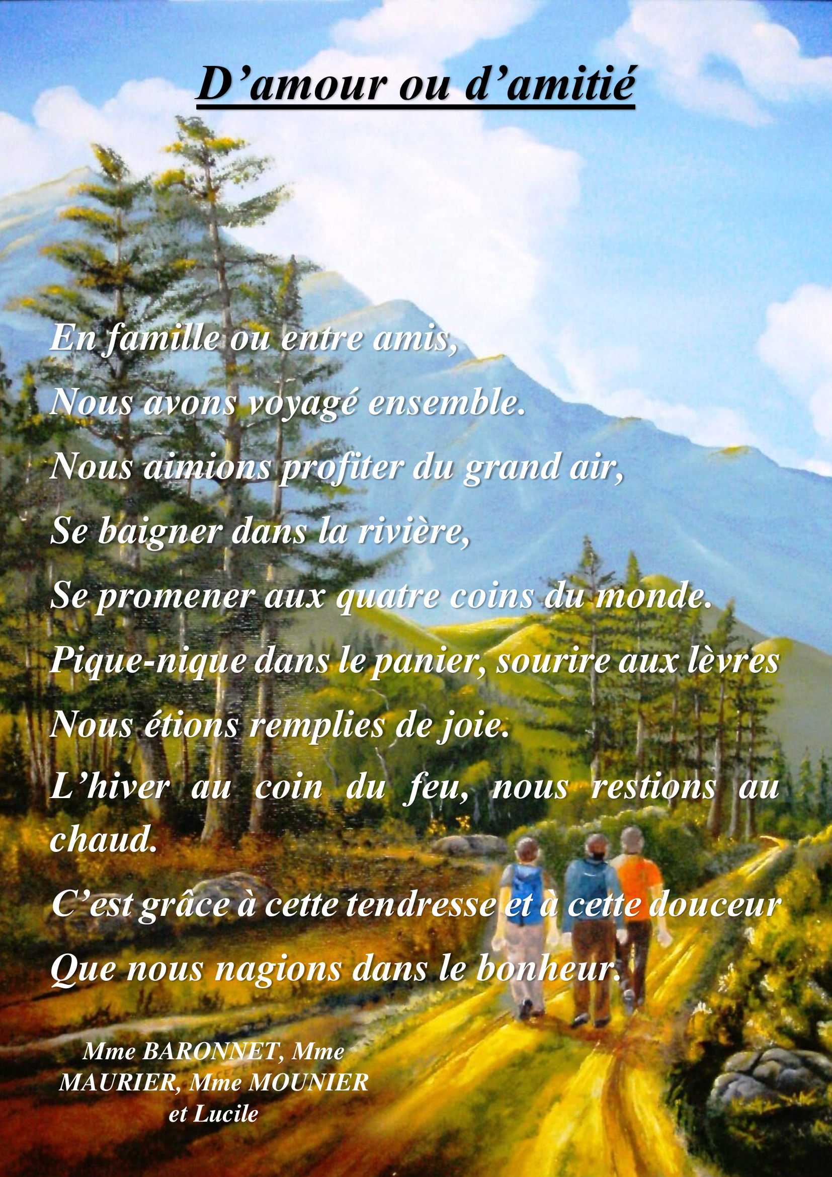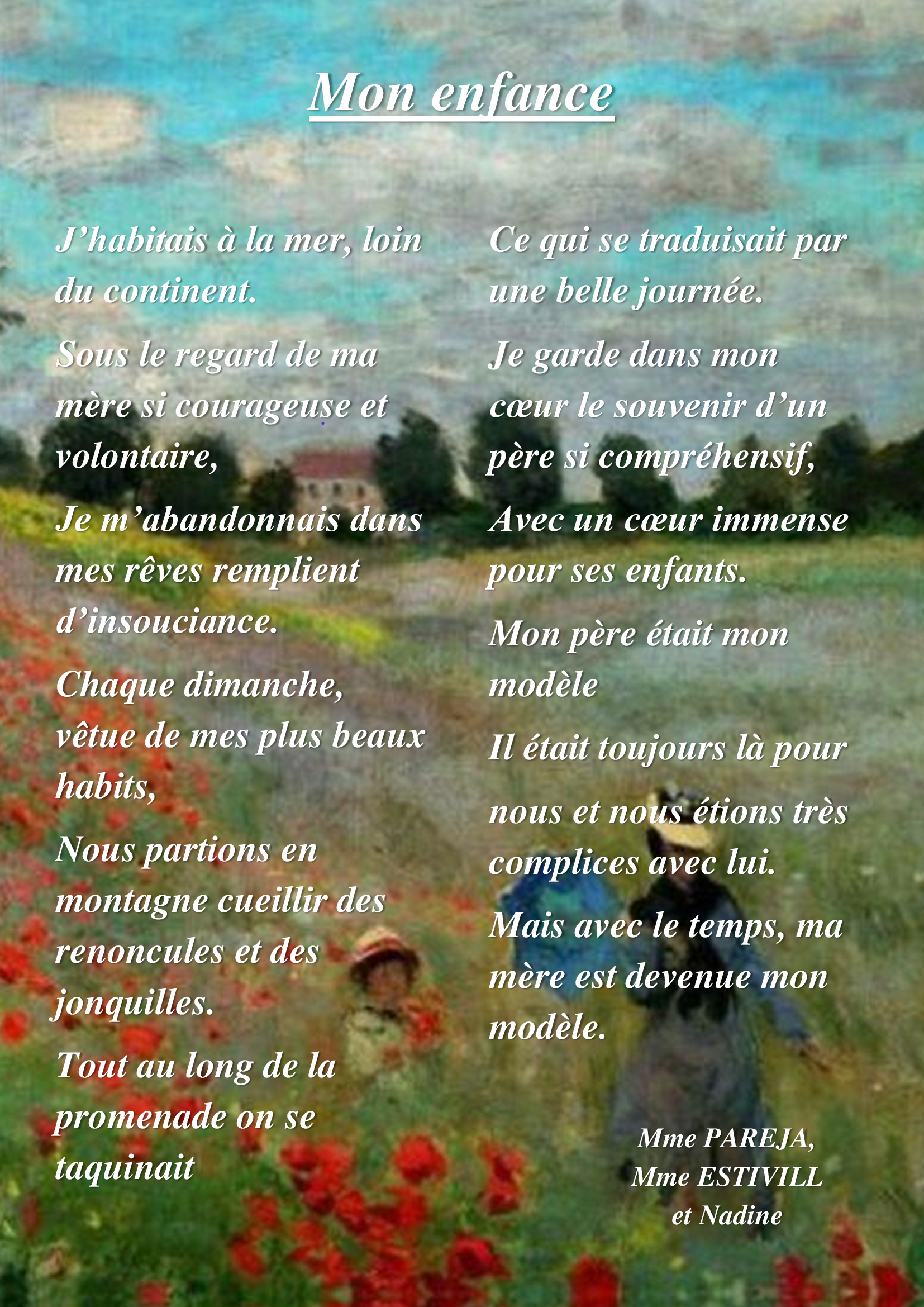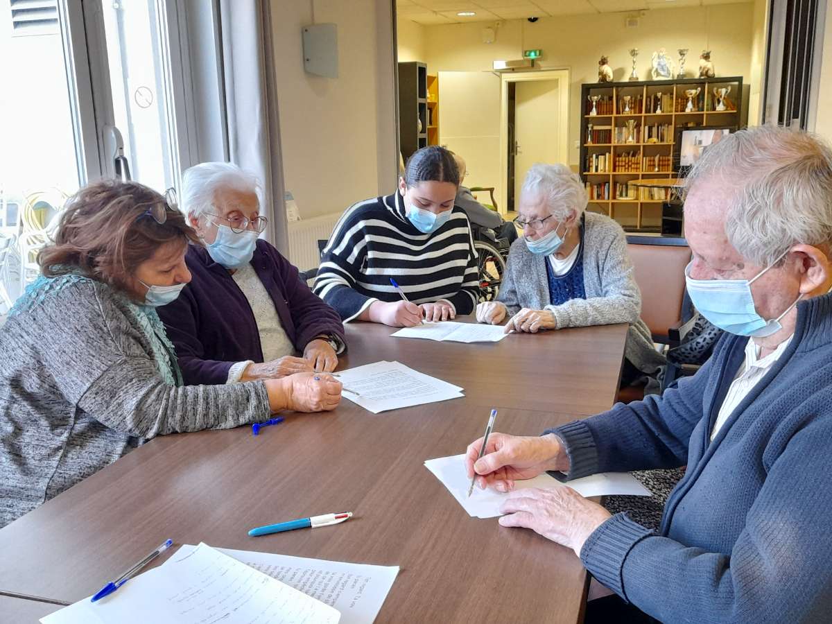 L’activité de ce jeudi 10 février a été consacré aux poèmes. Nous avons commencé par lire quelques pages d’Alfred de Musset, de Roger Kowalski ou encore de Charles Juillet. Ensuite, les résidents ont essayé de créer leur propre poème, en évoquant les thèmes qui leur parlent le plus et en écrivant leurs propres souvenirs. Ce fut un moment agréable où nous avons échangé et souri ensemble. Nous sommes fiers de vous présenter ces poèmes ci-dessous.
