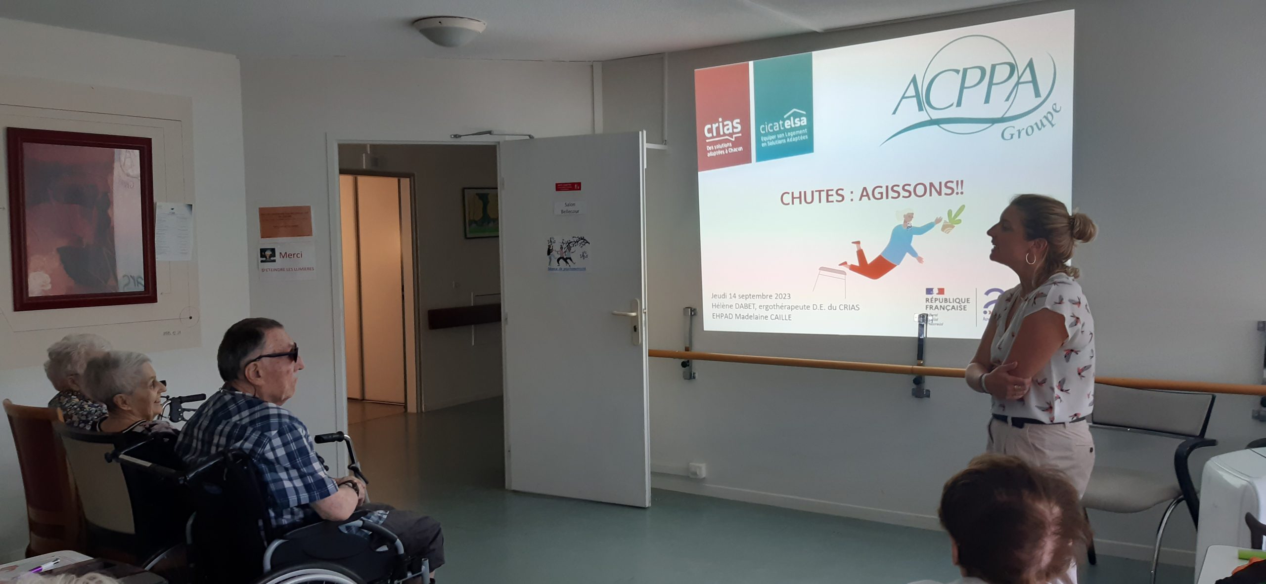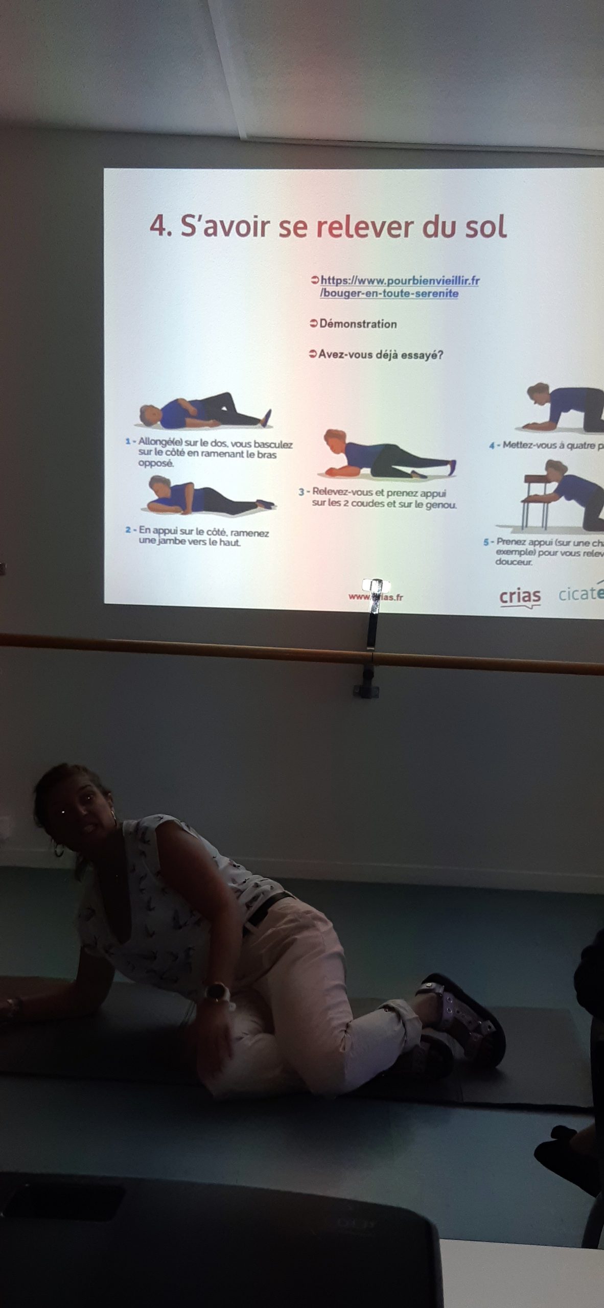 C’est dans le cadre d’un projet de l’ARS sur la prévention des chutes, qu’Hélène DABET, coordinatrice CICAT Elsa, est venue au sein de notre établissement pour animer deux ateliers d’information collective pour prévenir les risques de chute et apprendre à se relever en cas de chute non-grave.