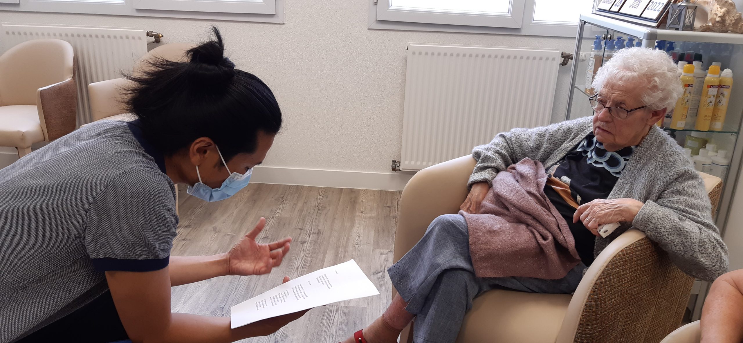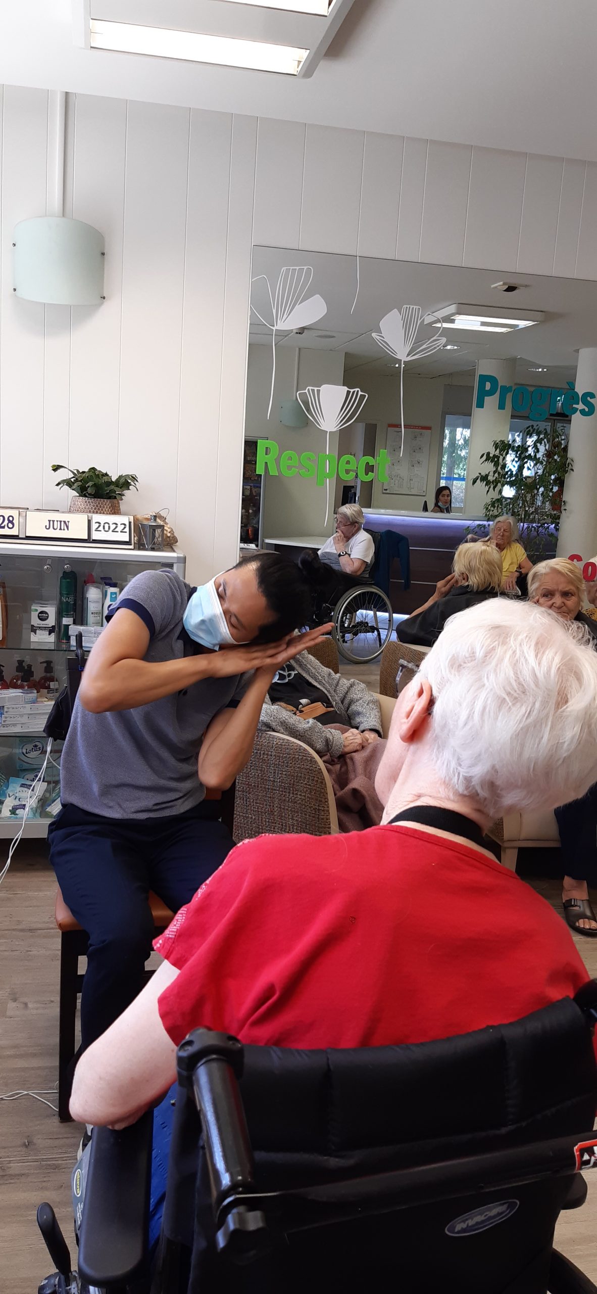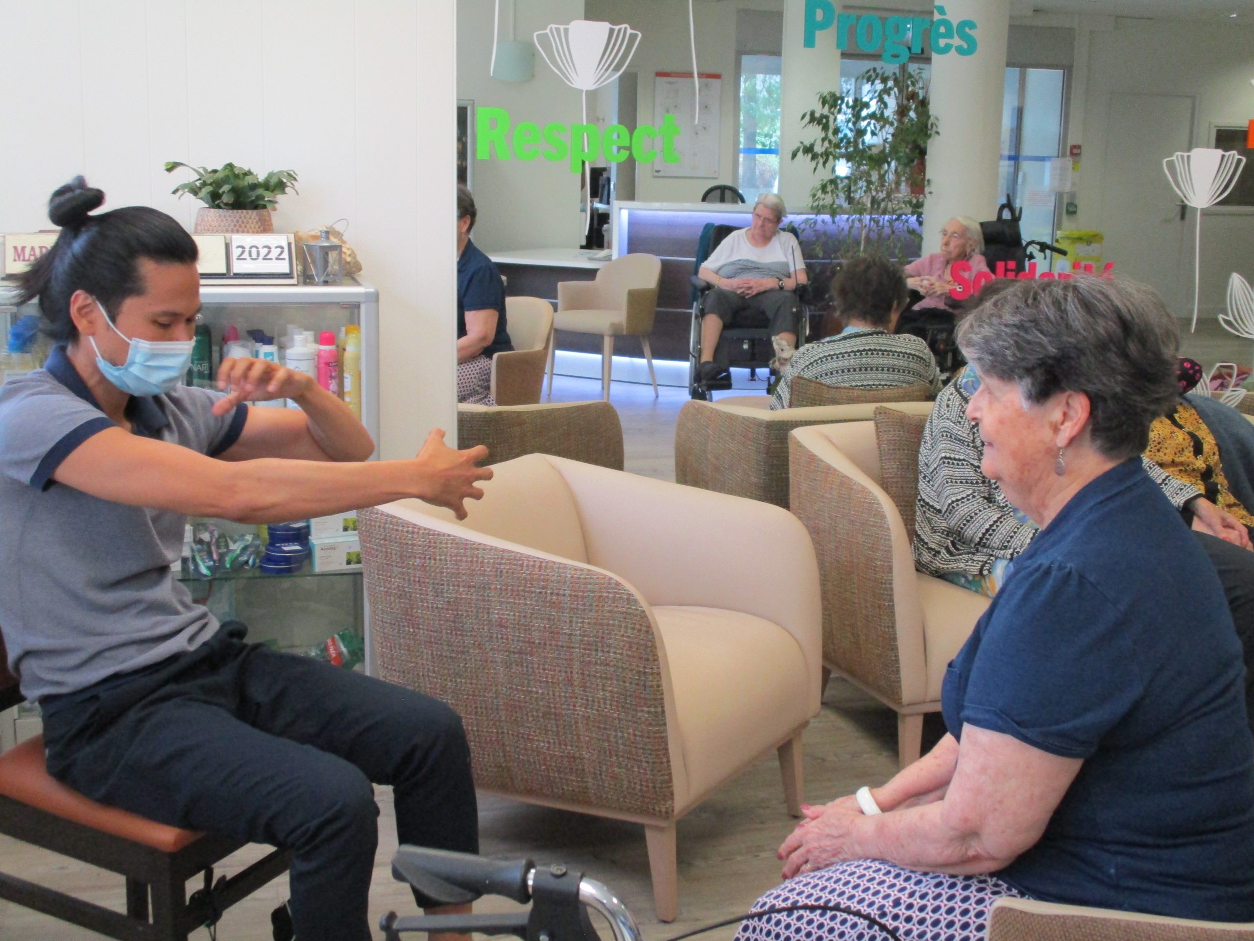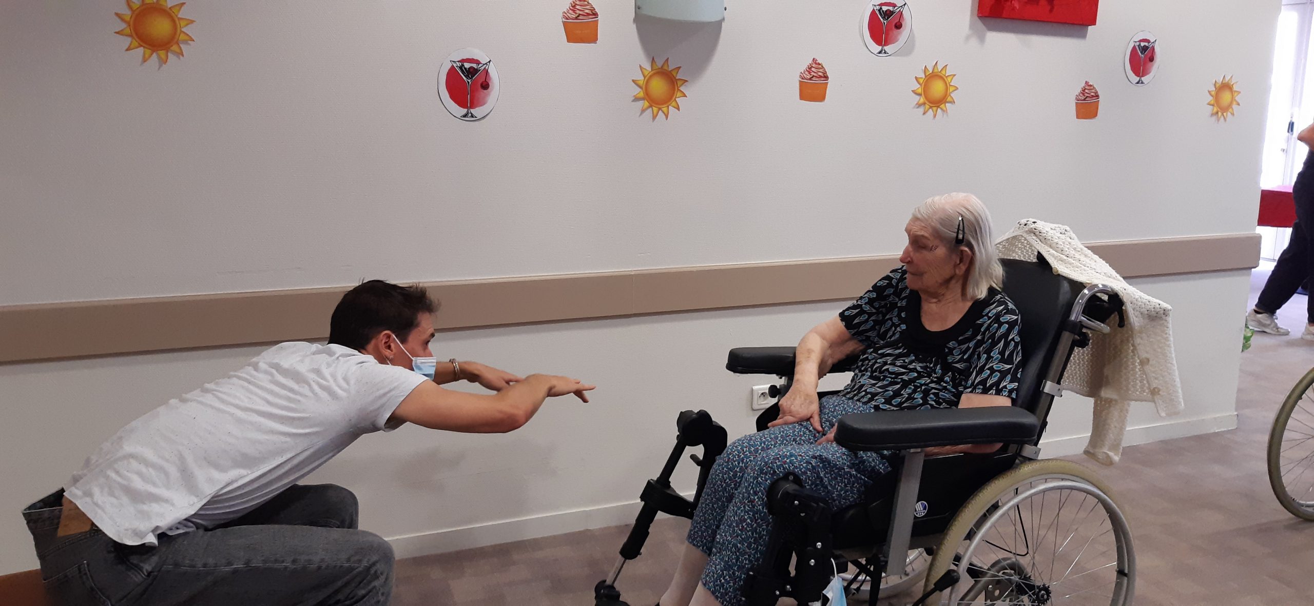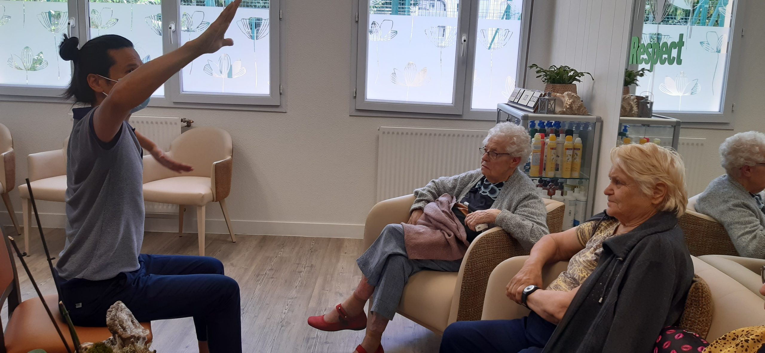 En amont de la rencontre avec les danseurs,  les résidents avaient choisi trois thématiques (nature, amour et la maison de retraite) et ils ont choisi des mots sur les trois sujets. Le jour de la rencontre avec Camille, Sébastien et Thomas, danseurs de la Maison de la danse, les résidents ont pu apprécier les poèmes avec les mots choisis et ont observé les chorégraphies effectuées par les artistes. Beaucoup de résidents ont pu échanger leur ressenti après la prestation. Ce fut un moment rempli d’émotion !!!!