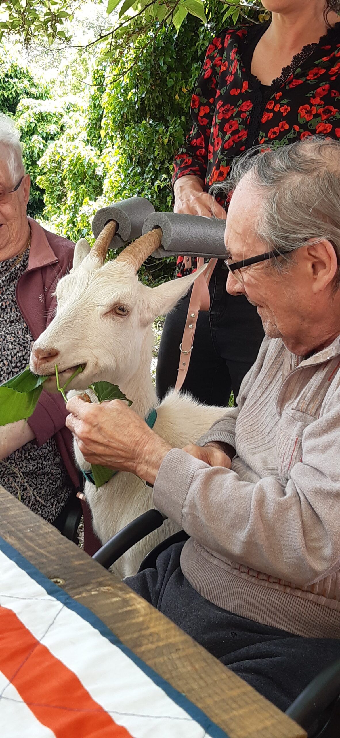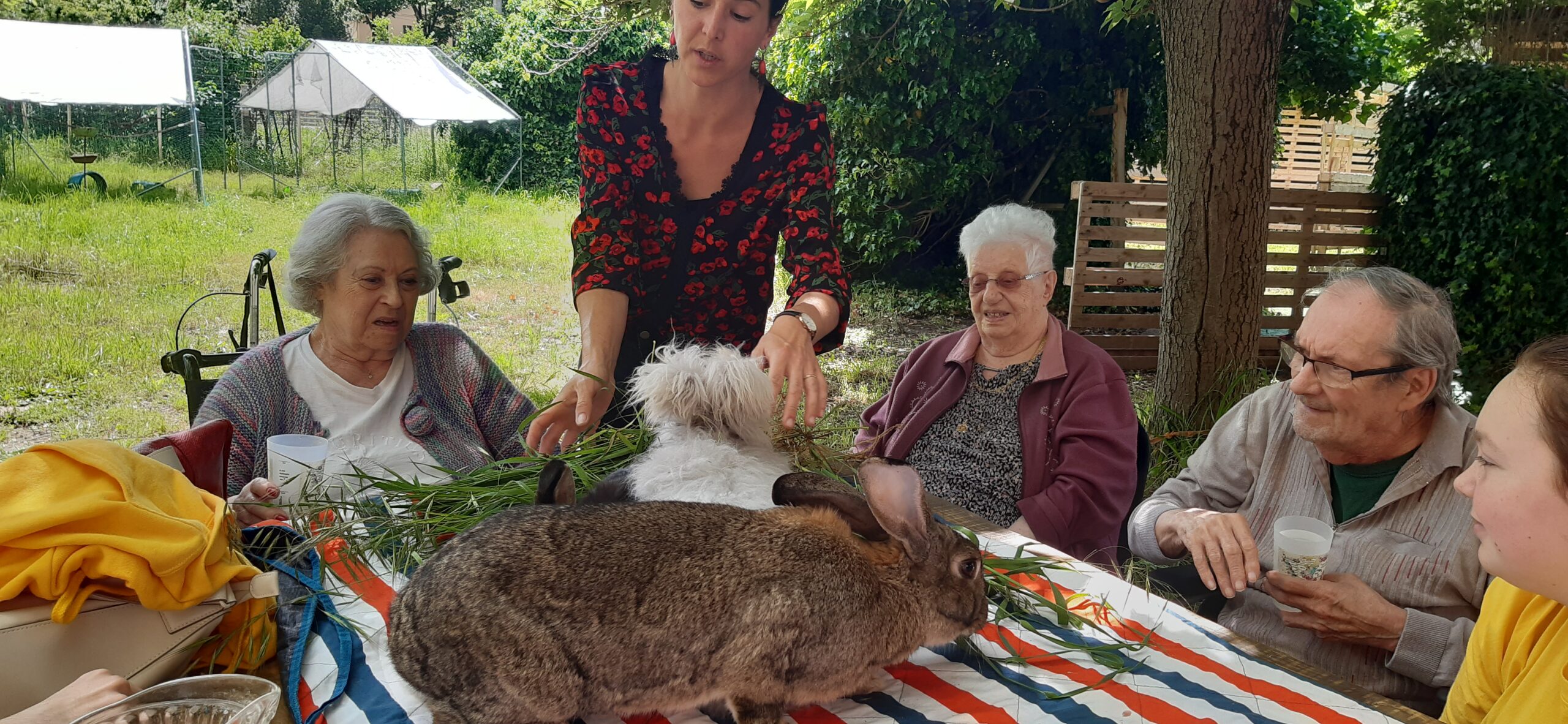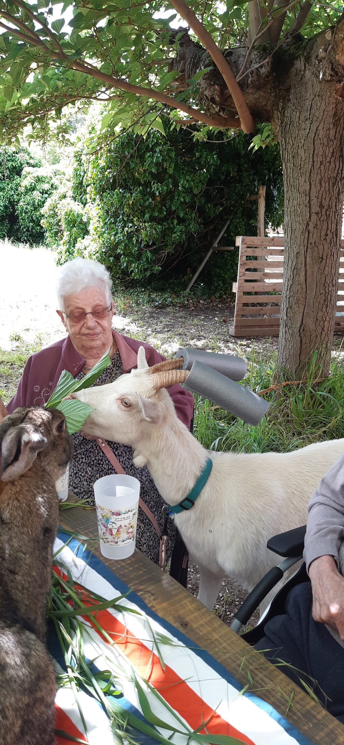 Ce jeudi 23 mai, une poignée de résidents ont pu visiter la ferme de Marion, notre zoothérapeute. Le beau temps était fort heureusement au rendez-vous, et les résidents ont pu ainsi se familiariser avec certains animaux de la ferme : poules, lapins et chèvres.