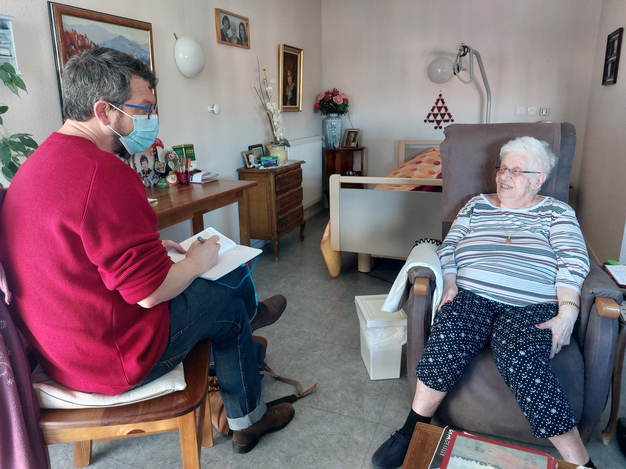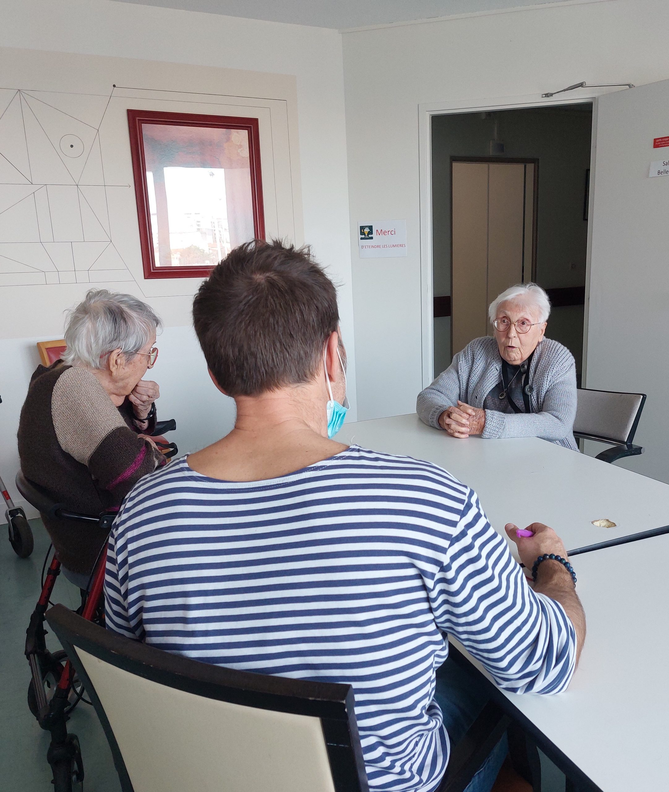 - Matthieu, Simon et Cécile ont rencontré en groupe et individuellement quelques résidents pour les interviewer sur leur vie, leur voyage. Puis avec le récit de ceux-ci, nos 3 écrivains ont écrit des textes remplis d’émotions et quelques fois plein d’humour. Nos personnes âgées étaient fières de raconter leur vie.