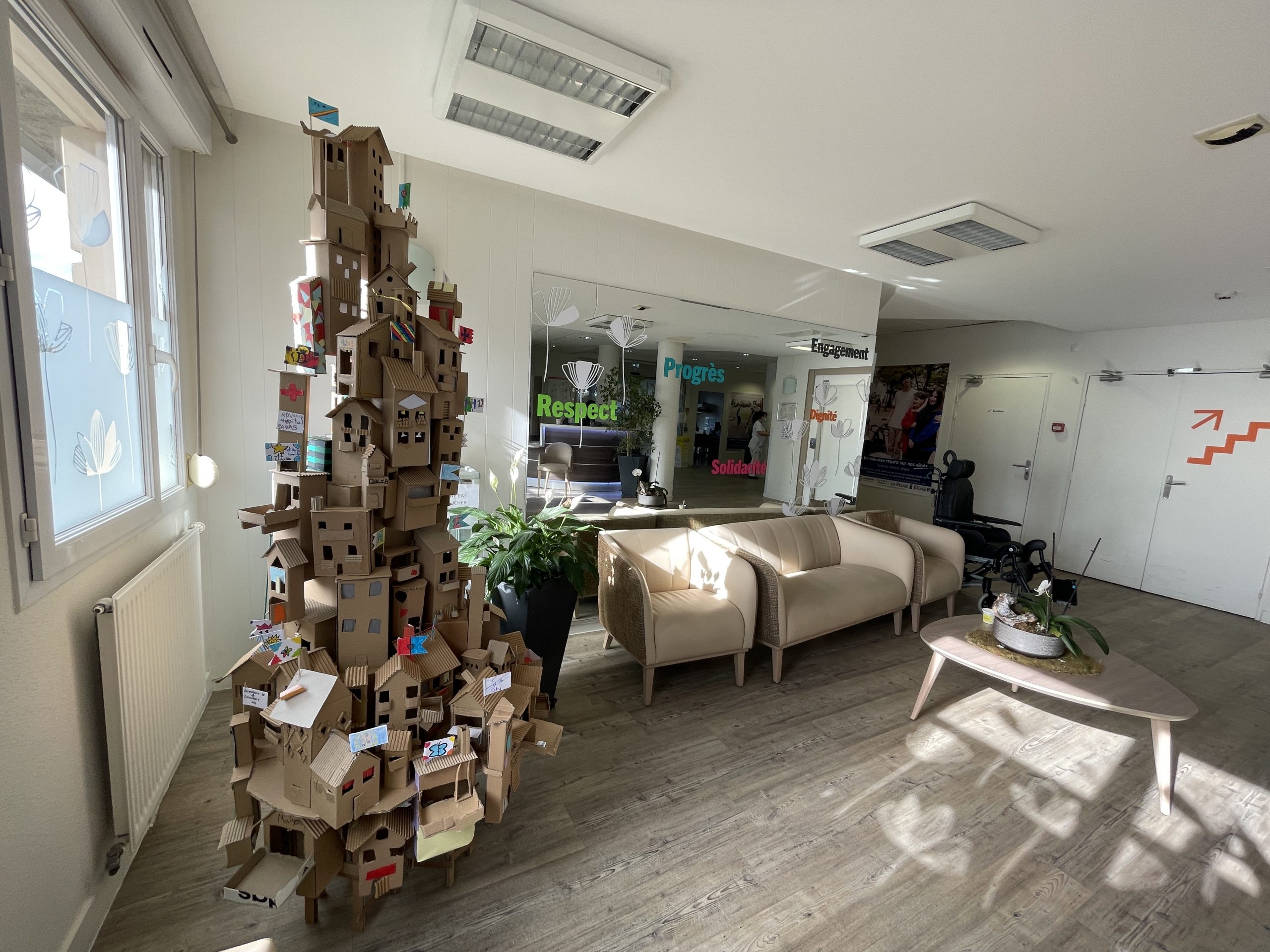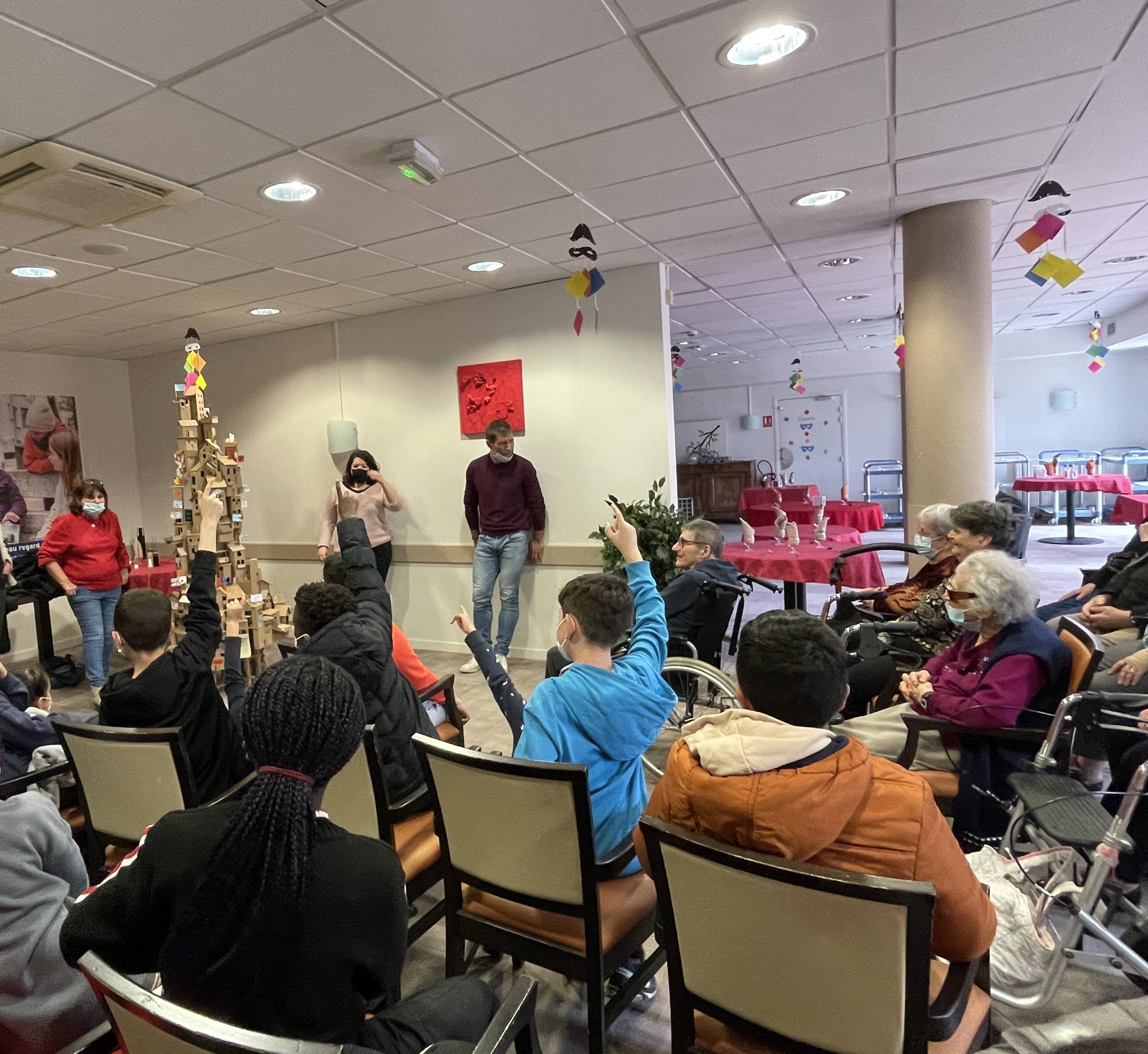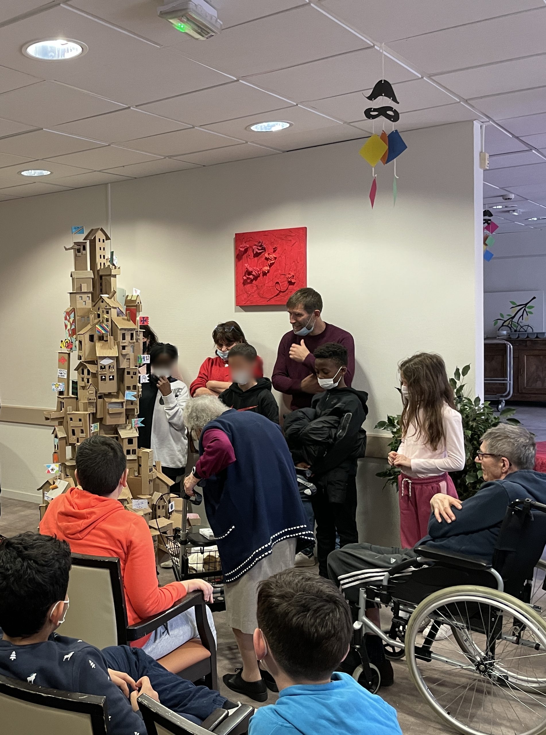 - Les élèves du CM2 sont venus nous présenter leur œuvre d’art pour la décoration du spectacle. Les résidents ont pu échanger avec eux sur comment ils ont créé leur ville. Nos résidents ont été étonnés de la splendeur de la réalisation. Un bon moment de discussion.