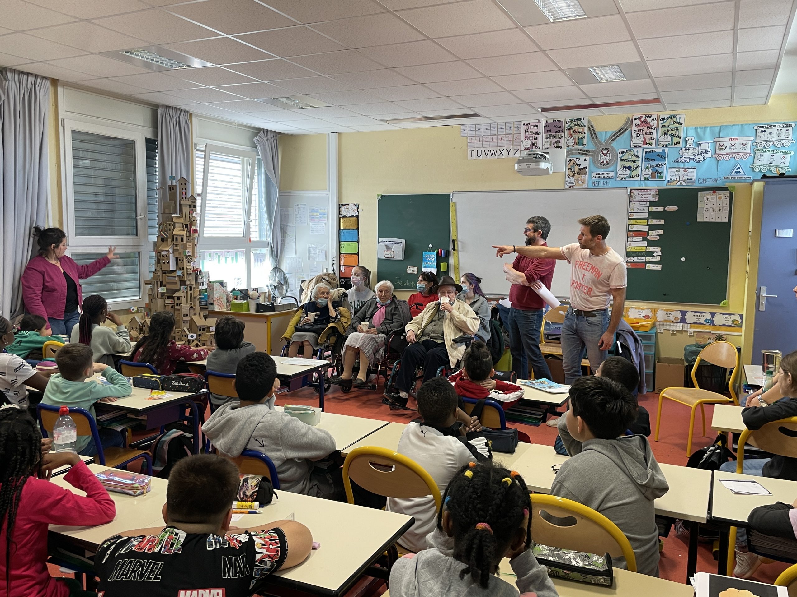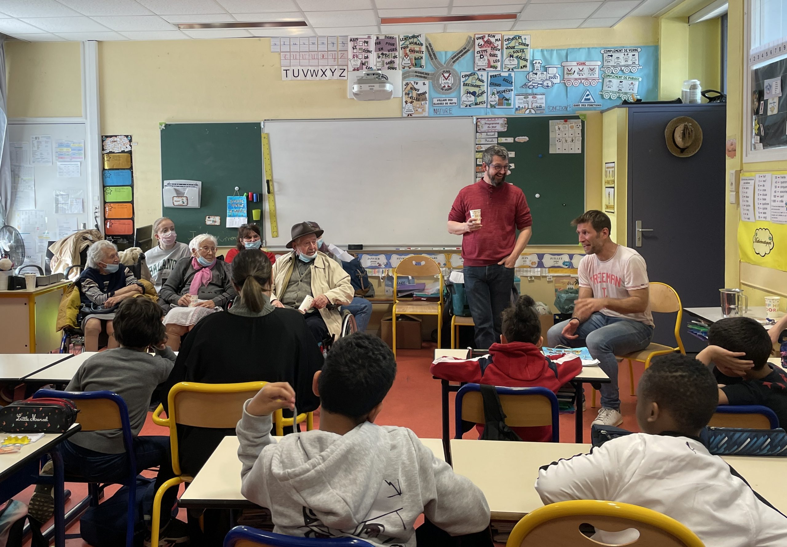 - Nous sommes partis par la suite à l’école primaire Louis Pergaud à la rencontre d’une deuxième classe de CE2 pour que les enfants découvrent les textes écrits pour la création des danses. Les enfants étaient très curieux, surtout par rapport à l’âge de nos résidents. Quelle émotion lorsque les élèves ont su qu’un de nos résidents était le père noël dans leur école il y a quelques années! Nos résidents étaient très à l’écoute et ils étaient très heureux de ce moment de partage.
